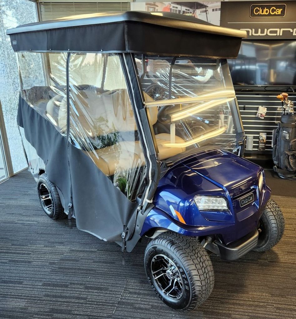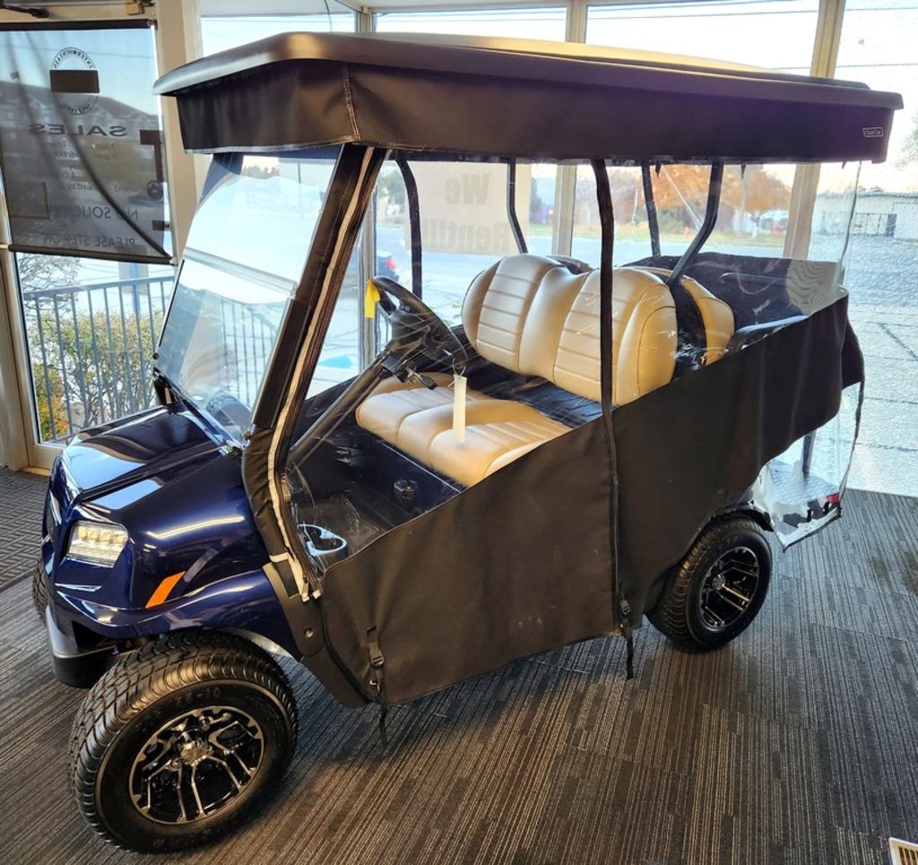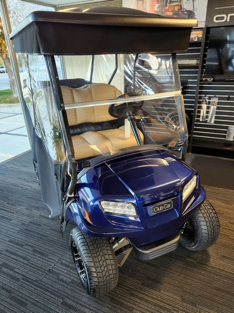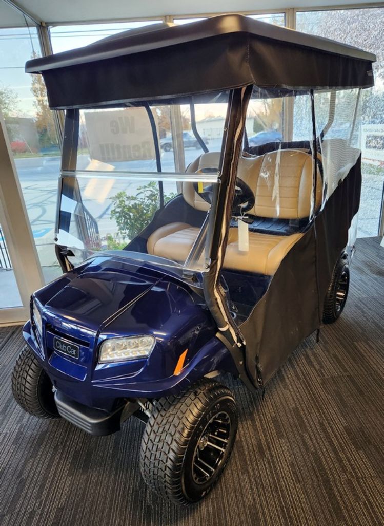 We are featuring a new 4-passenger 2023 Gas-powered, metallic blue onyx Club Car ONWARD golf cart with Many Extras!