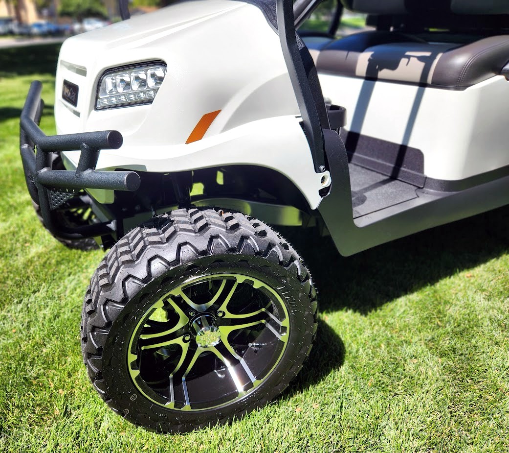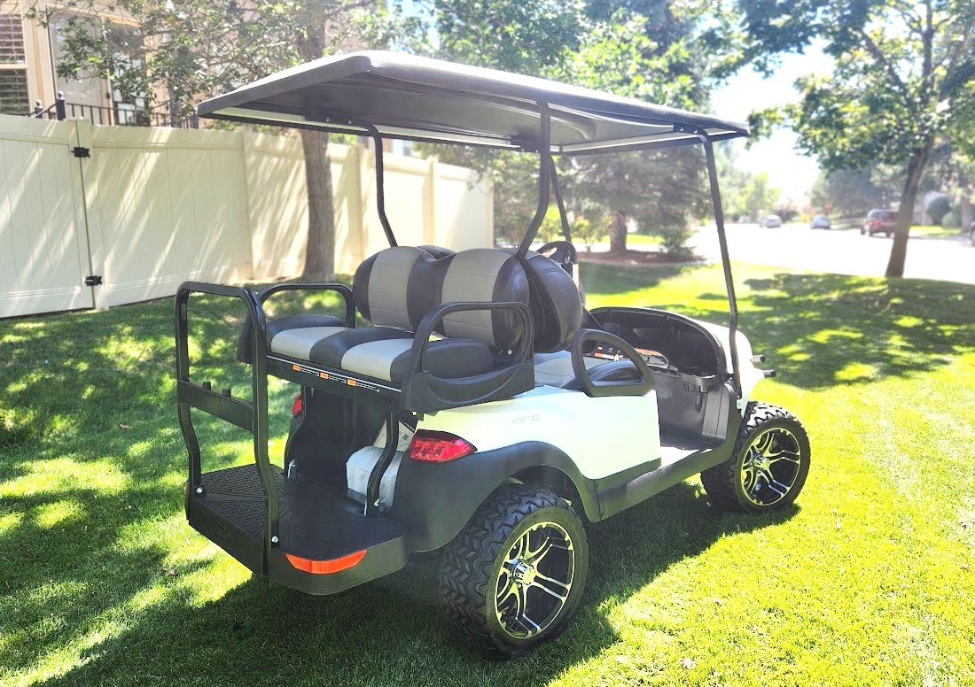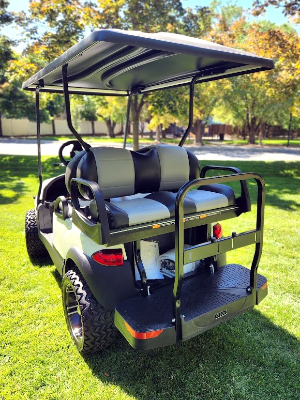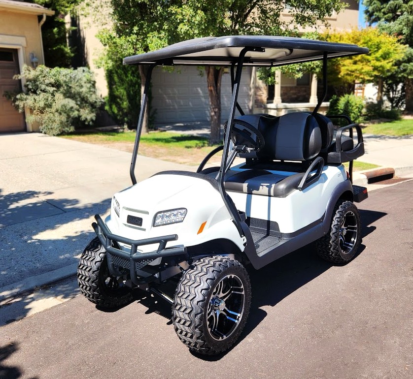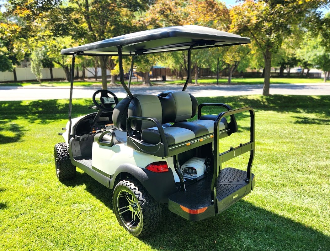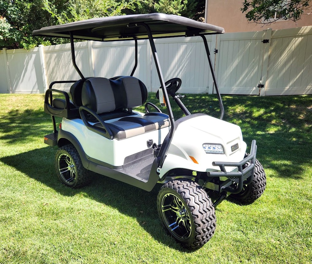 In our Sandy location, we are featuring a new 4-passenger factor lifted 2025 metallic glacier white electric Club Car ONWARD golf cart.
