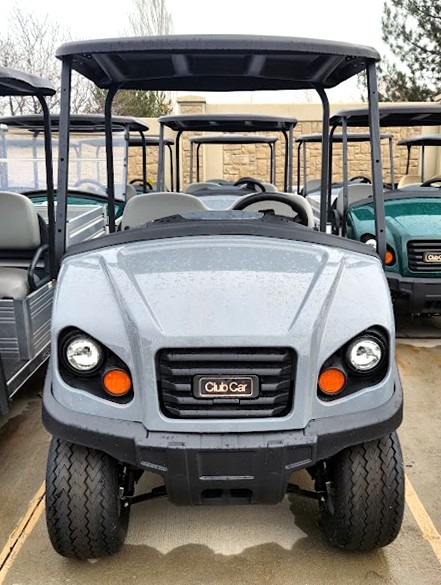 New 2025 Pearl mist gray Club Car Carryall 500 with lights, and dumping utility box.