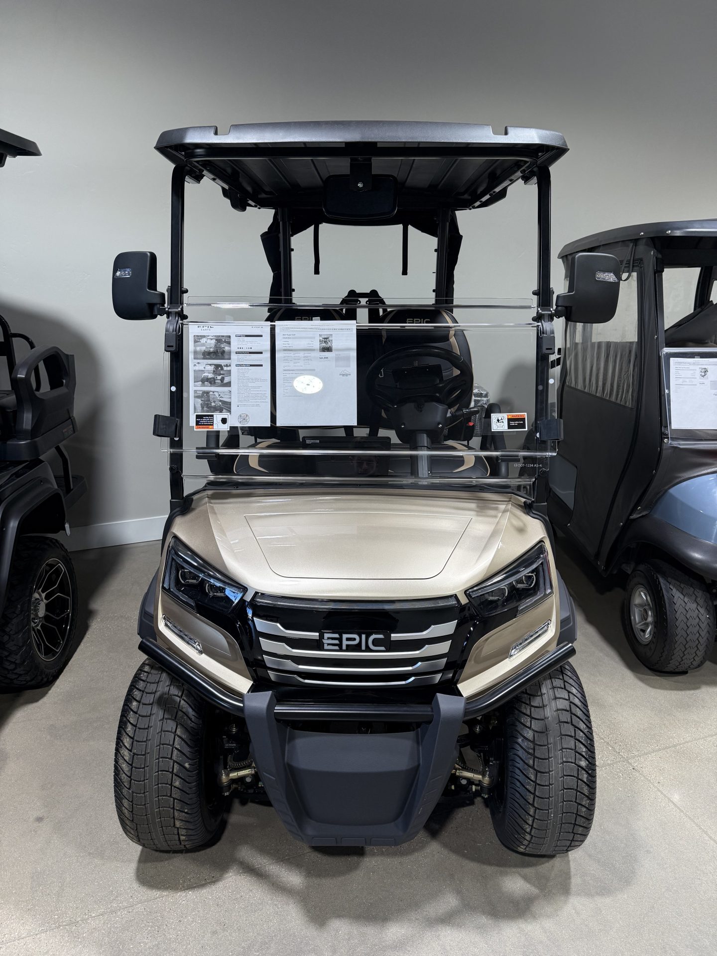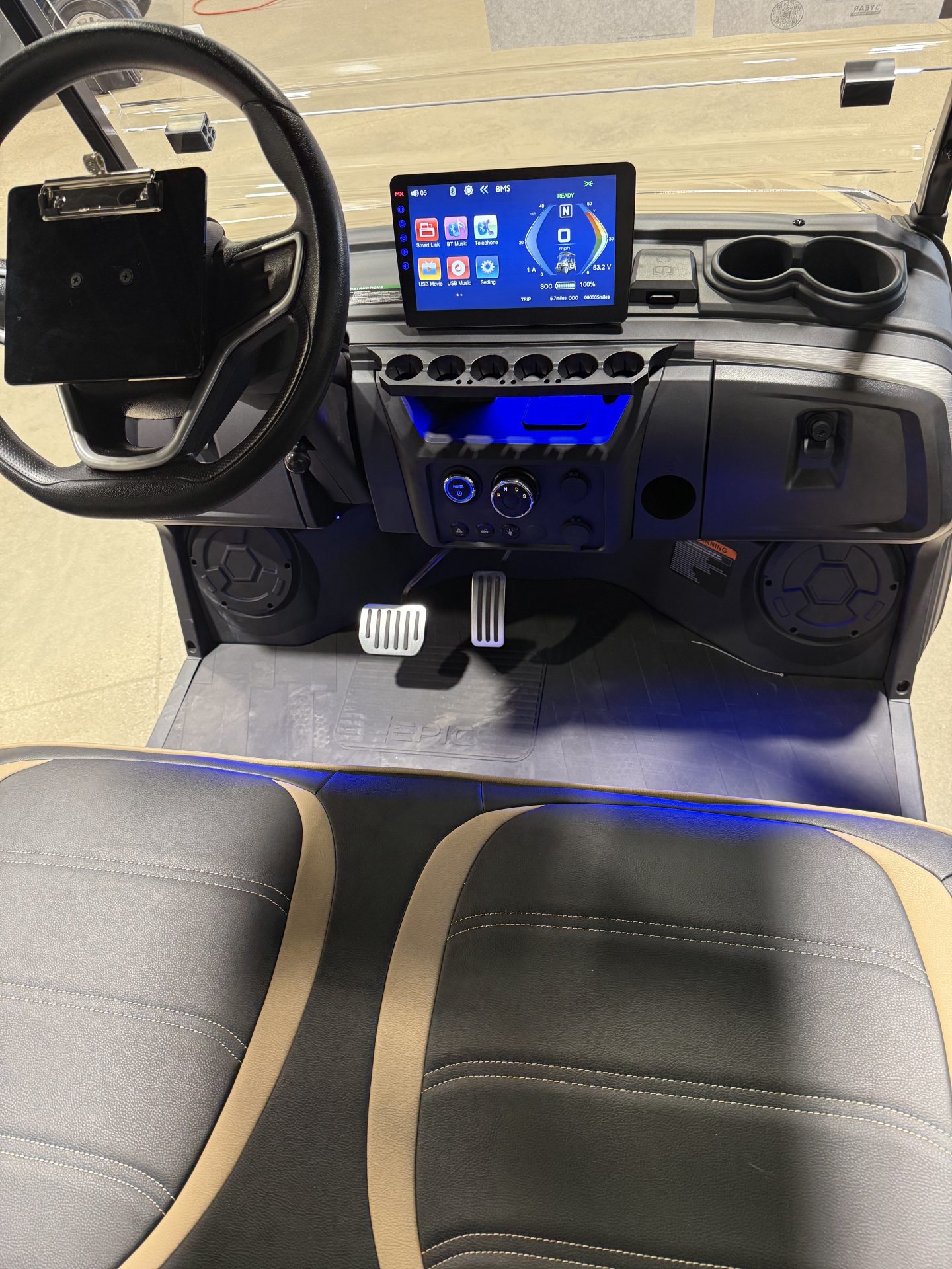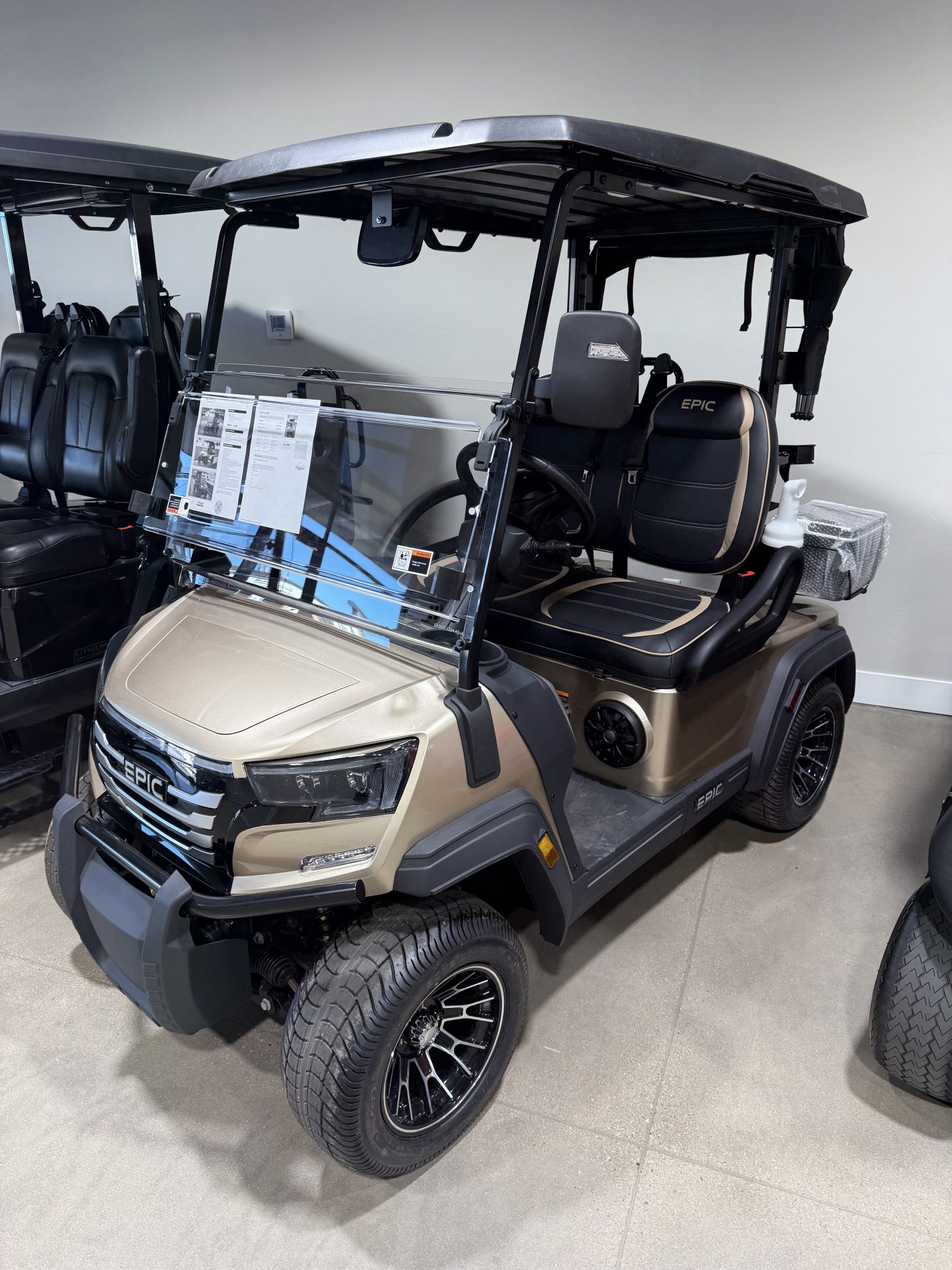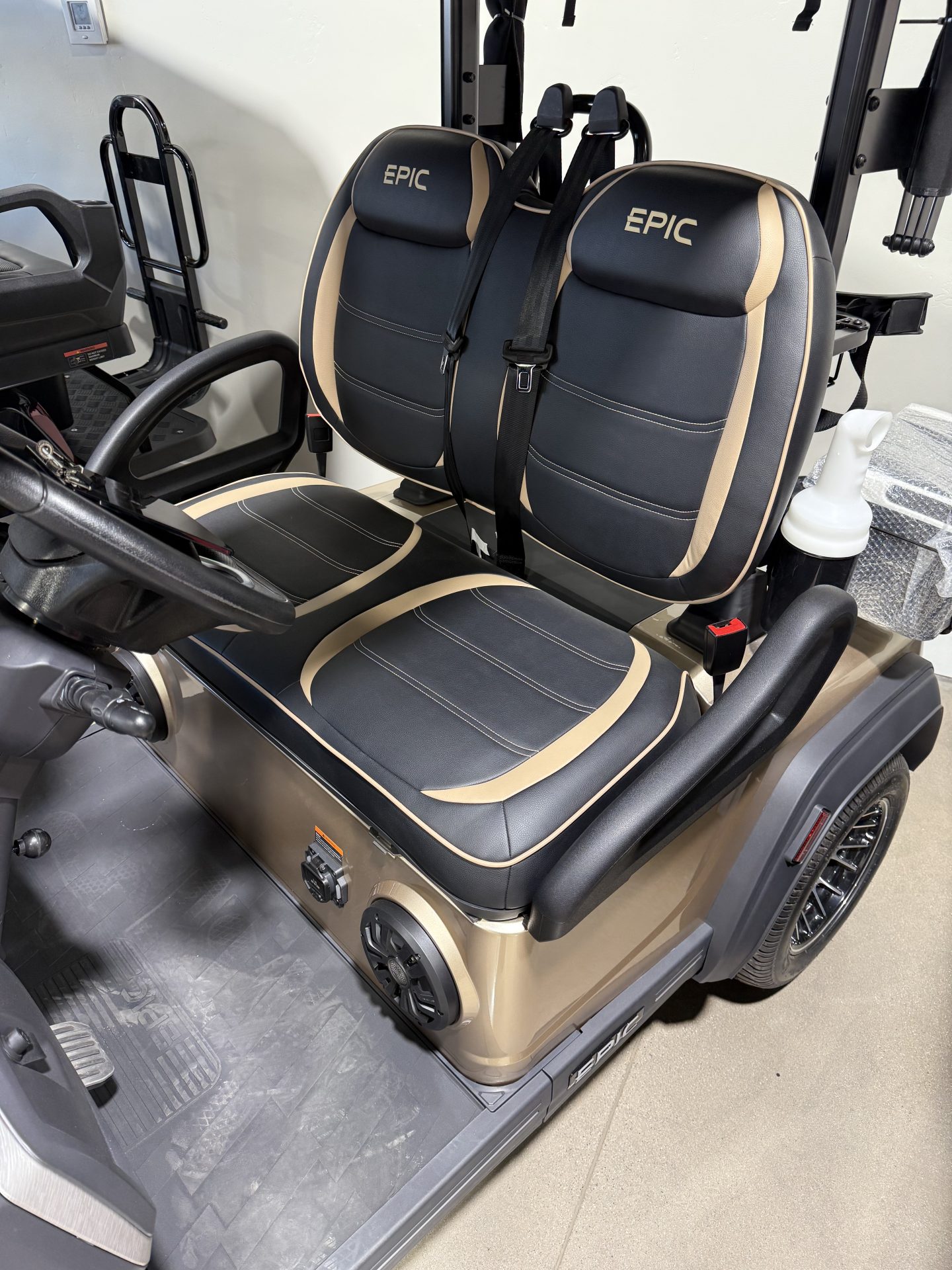 The brand new Epic E20FX golf cart model is creating quite the buzz industry-wide! Furnished with every desirable feature, this two-seater Epic golf cart comes in seven stylish metallic colors. Premium 12” turf friendly tires provide a super smooth and enjoyable ride on and off the golf course. With a top of the line built-in marine-grade sound system, stunning accent lighting, and a rear golf kit with two coolers, two sand bottles, and two golf bag holders, and golf bag rain cover, this Epic E20FX golf cart will make you the envy of every golfer on and off the course!