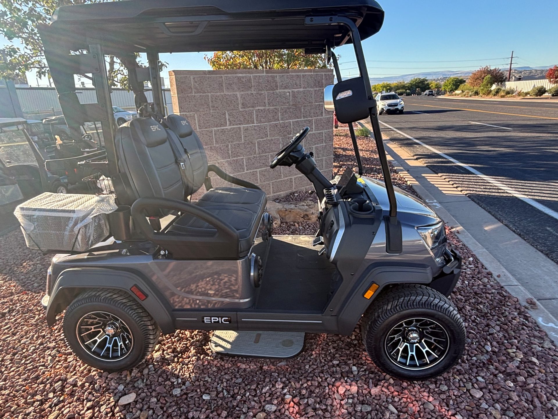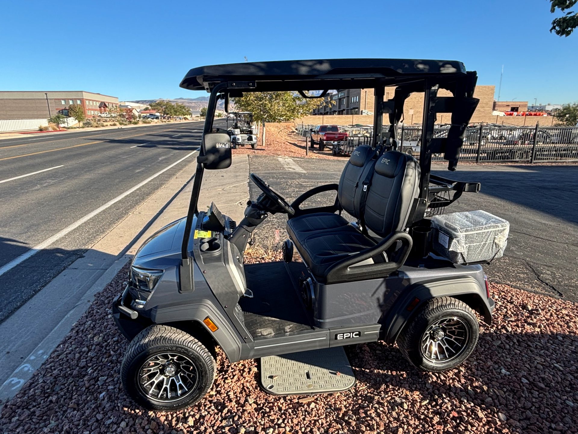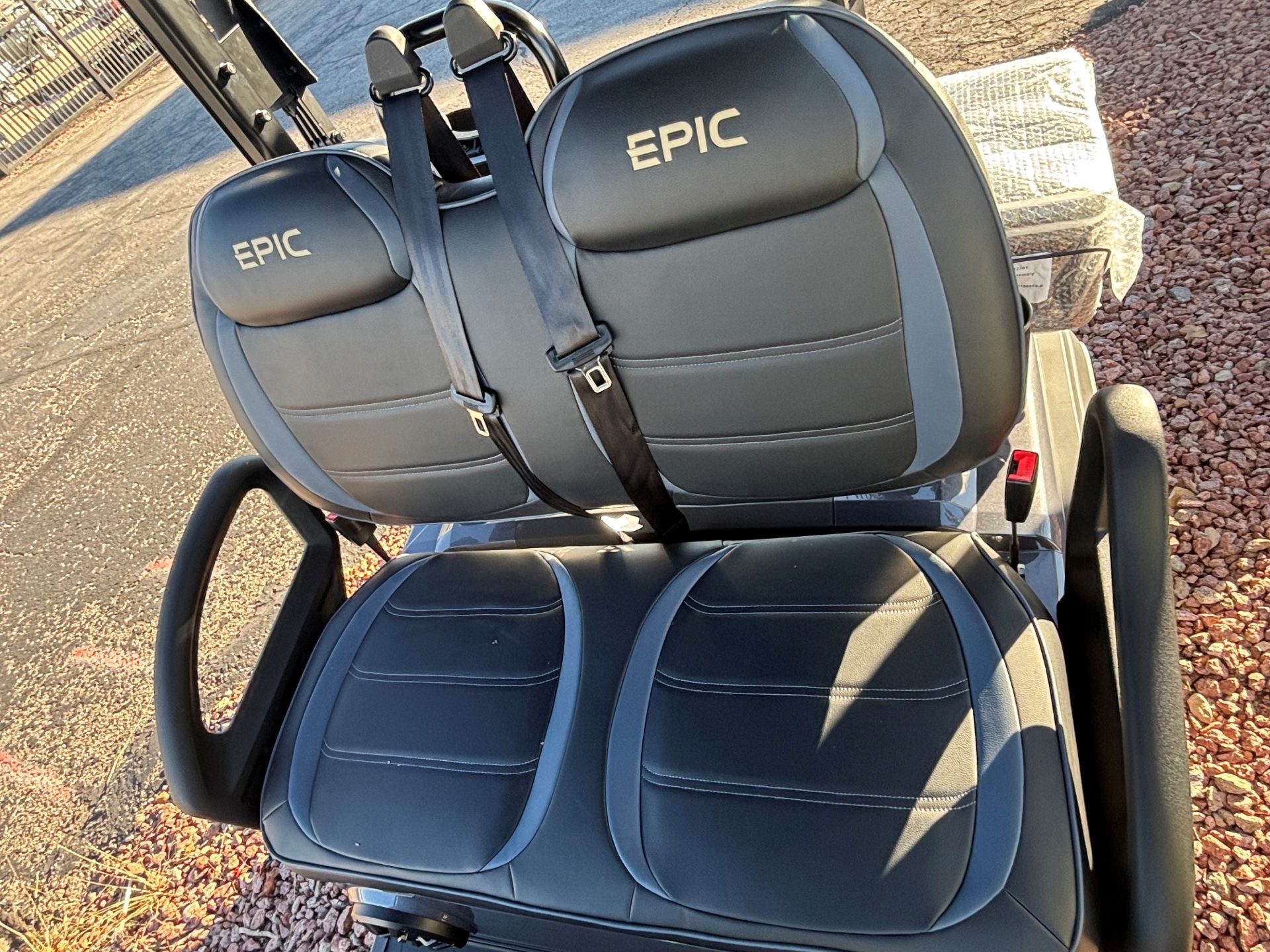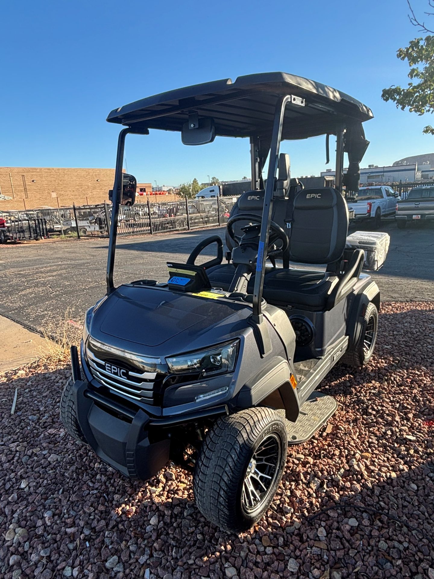 The brand new Epic E20FX golf cart model is creating quite the buzz industry-wide! Furnished with every desirable feature, this two-seater Epic golf cart comes in seven stylish metallic colors. Premium 12” turf friendly tires provide a super smooth and enjoyable ride on and off the golf course. With a top of the line built-in marine-grade sound system, stunning accent lighting, and a rear golf kit with two coolers, two sand bottles, and two golf bag holders, and golf bag rain cover, this Epic E20FX golf cart will make you the envy of every golfer on and off the course!