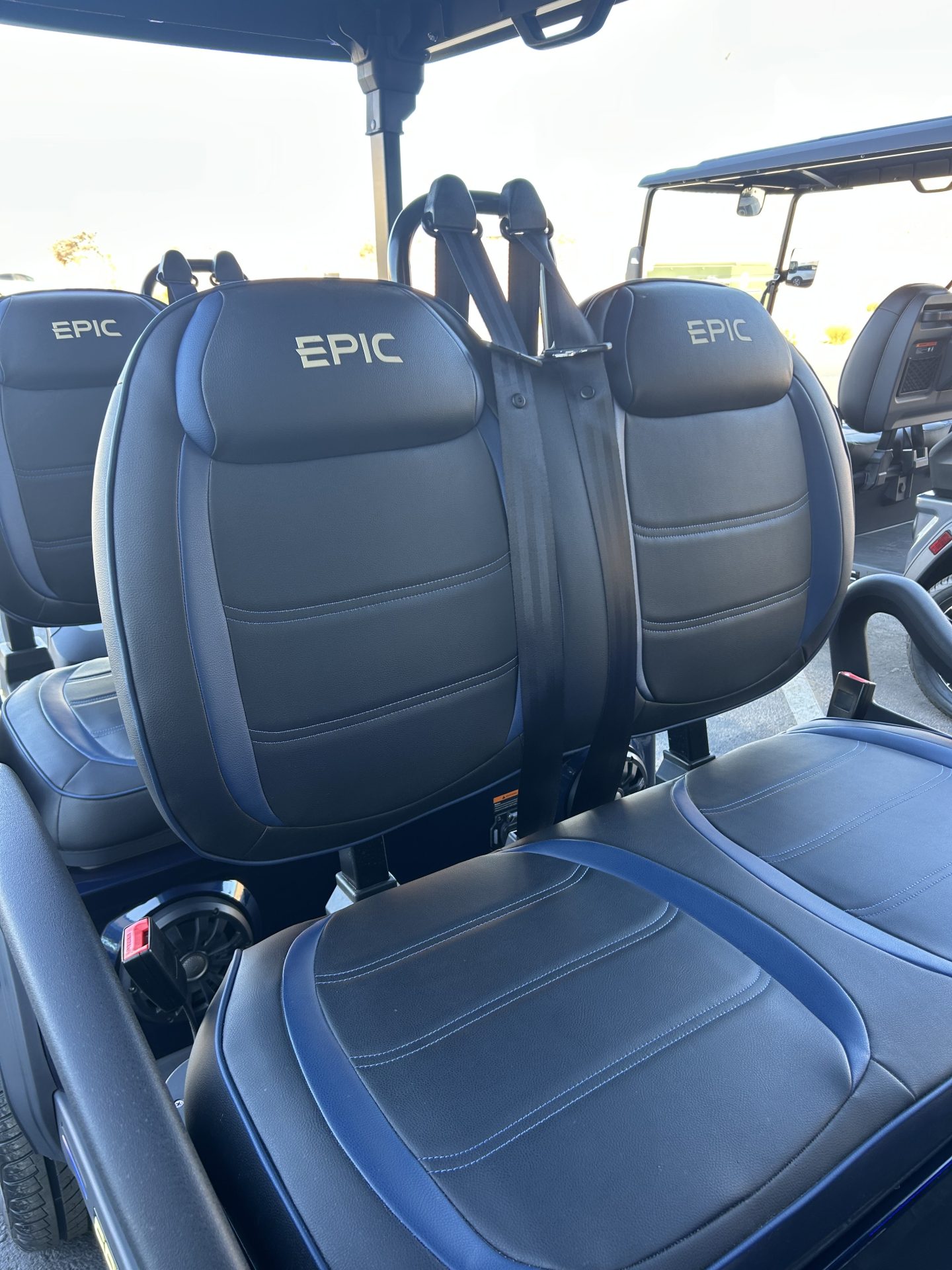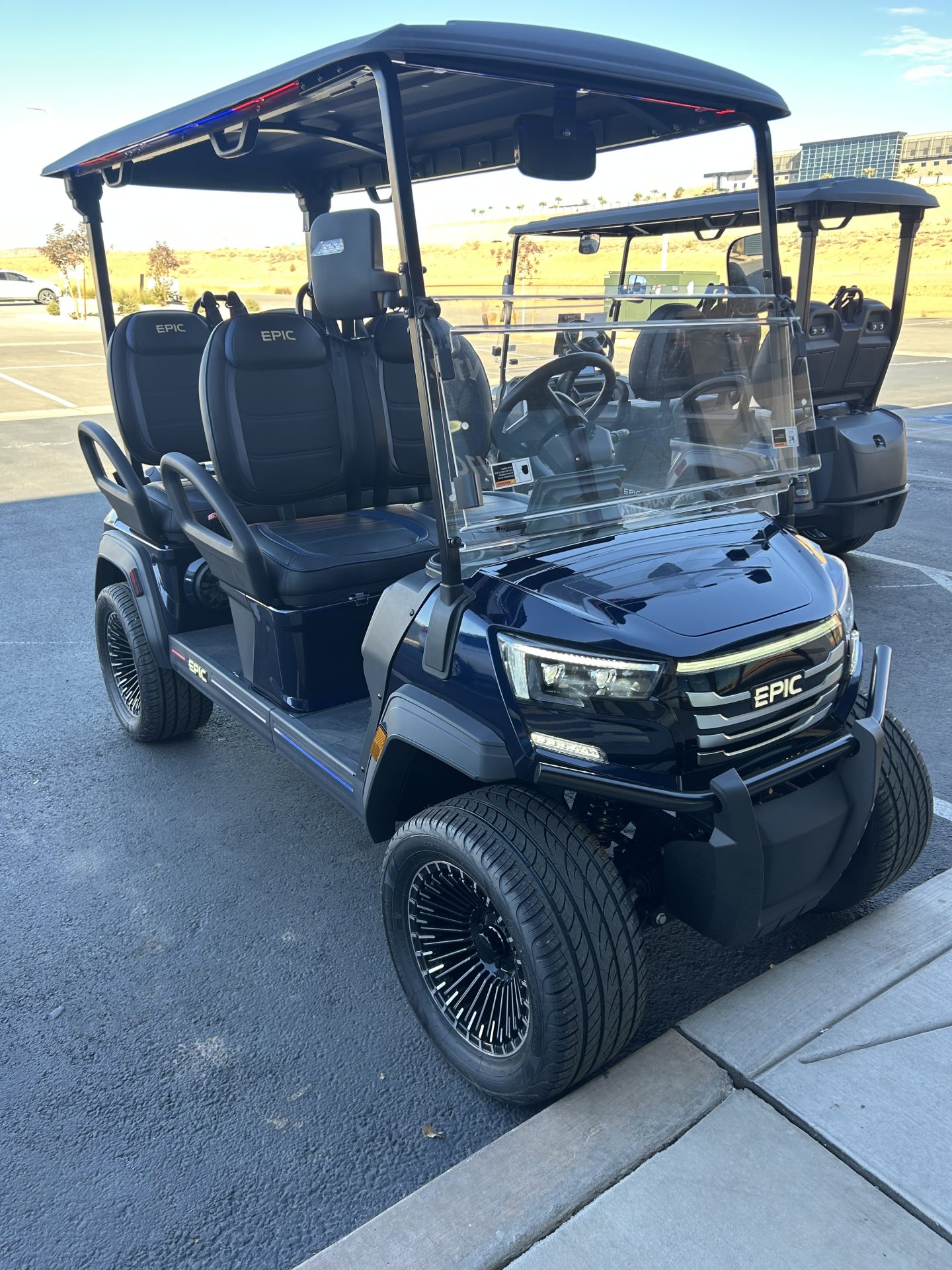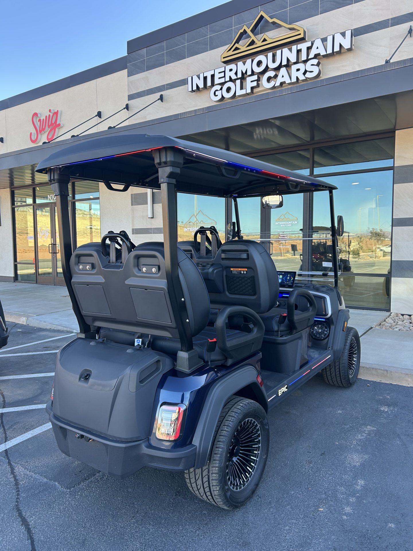 The brand new EPIC E40FX is one of the best golf carts on the market today! Furnished with every imaginable feature, the forward-facing four-seater EPIC E40FX comes in six stylish colors and three height options. Premium 14” wheels and street-ready tires provide a solid foundation for every journey on every terrain, no matter what lift height is selected. With an abundance of storage, superior built-in marine-grade sound system and speakers, and stunning accent lighting, this EPIC golf cart illuminates the possibilities for fun and adventure.