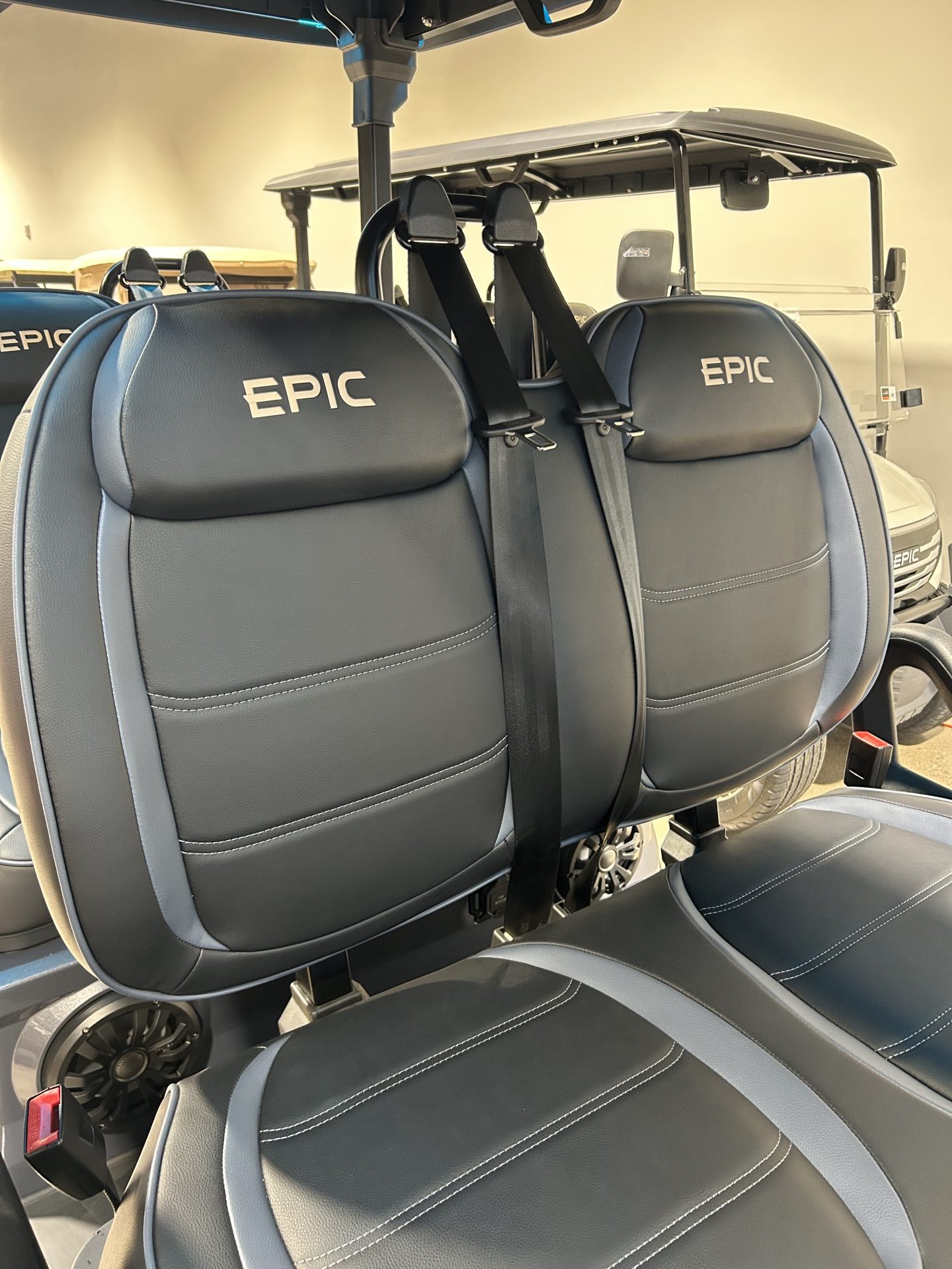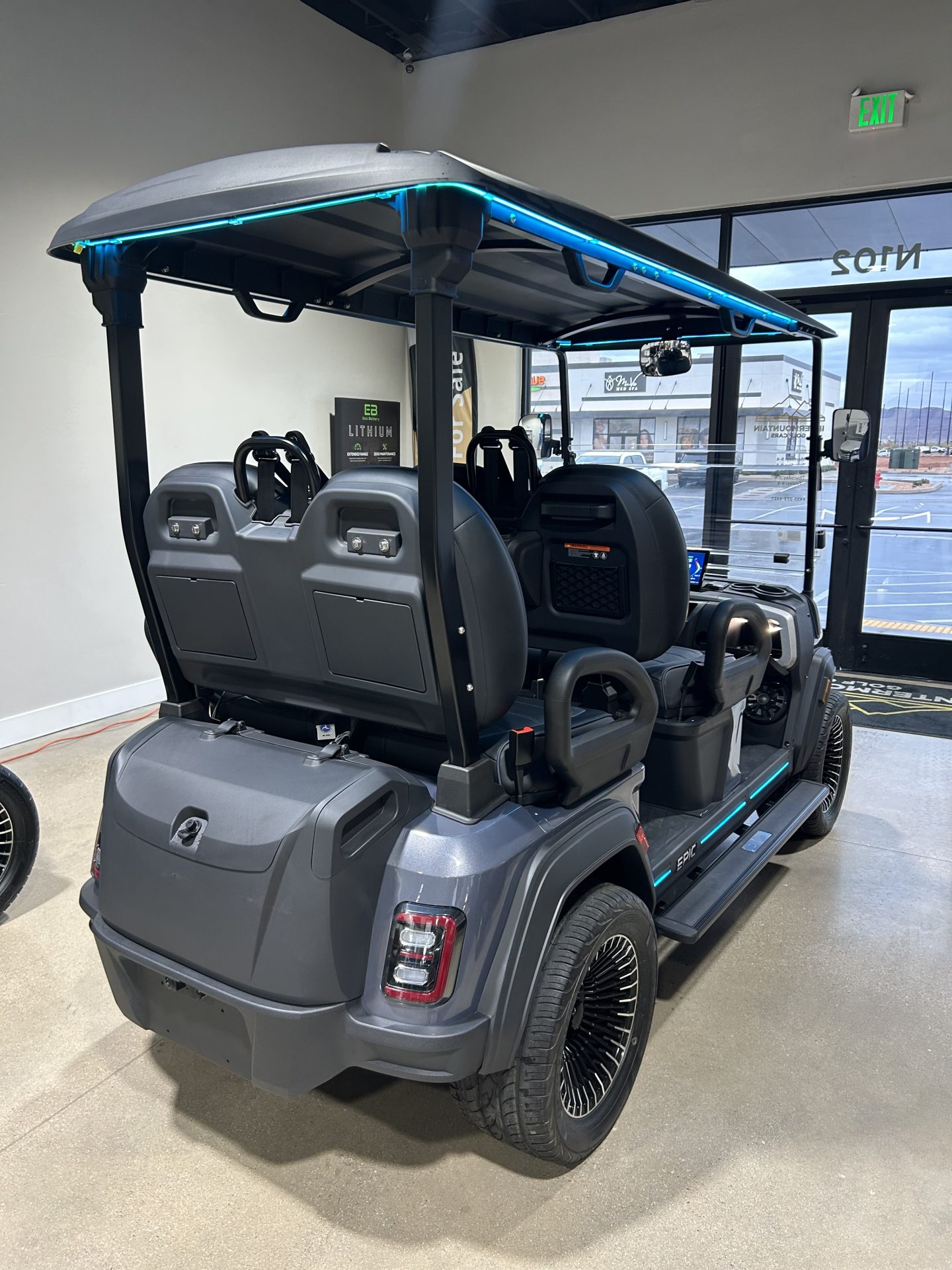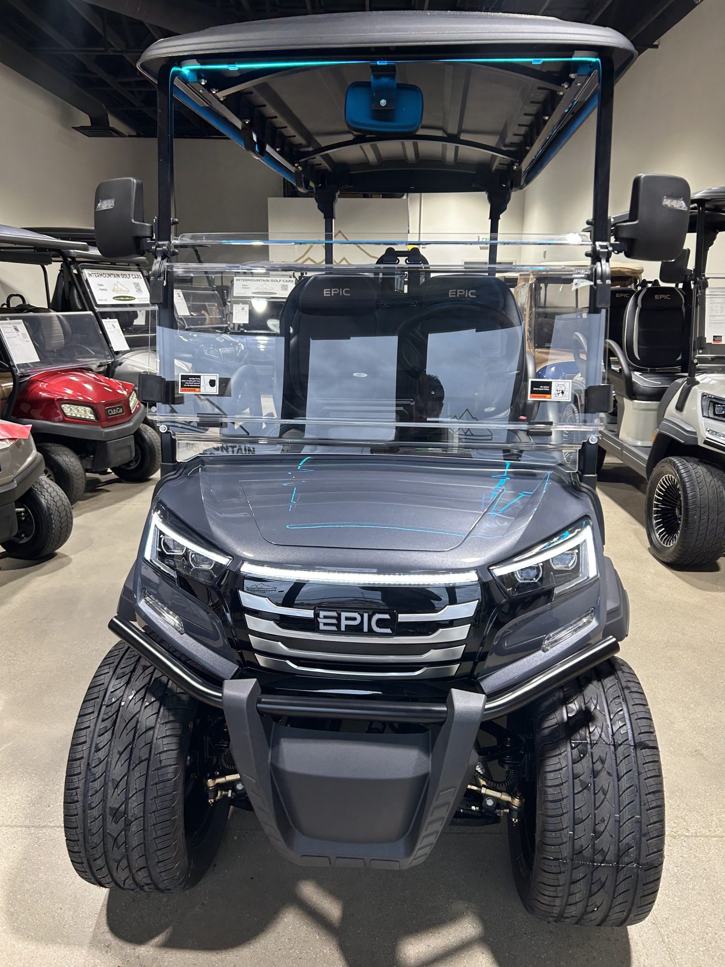 The brand new EPIC E40FX is one of the best golf carts on the market today! Furnished with every imaginable feature, the forward-facing four-seater EPIC E40FX comes in six stylish colors and three height options. Premium 14” wheels and street-ready tires provide a solid foundation for every journey on every terrain, no matter what lift height is selected. With an abundance of storage, superior built-in marine-grade sound system and speakers, and stunning accent lighting, this EPIC golf cart illuminates the possibilities for fun and adventure.