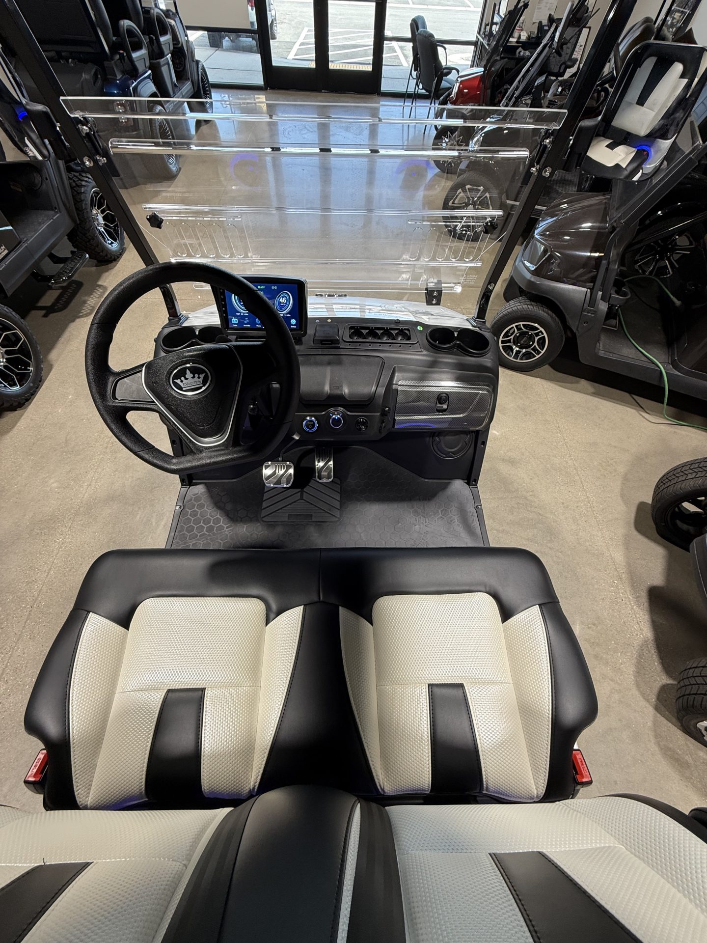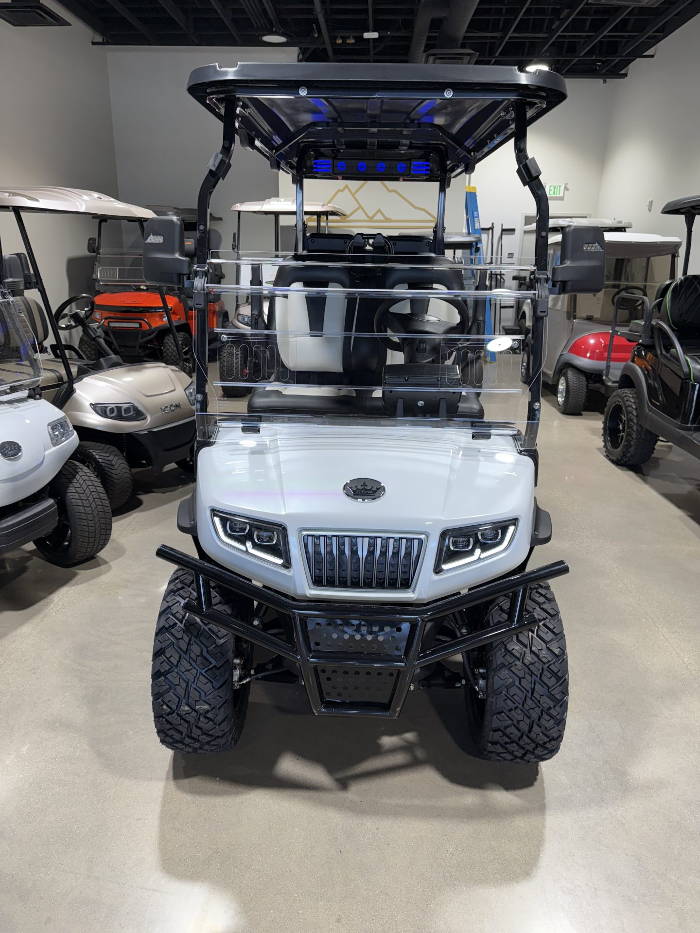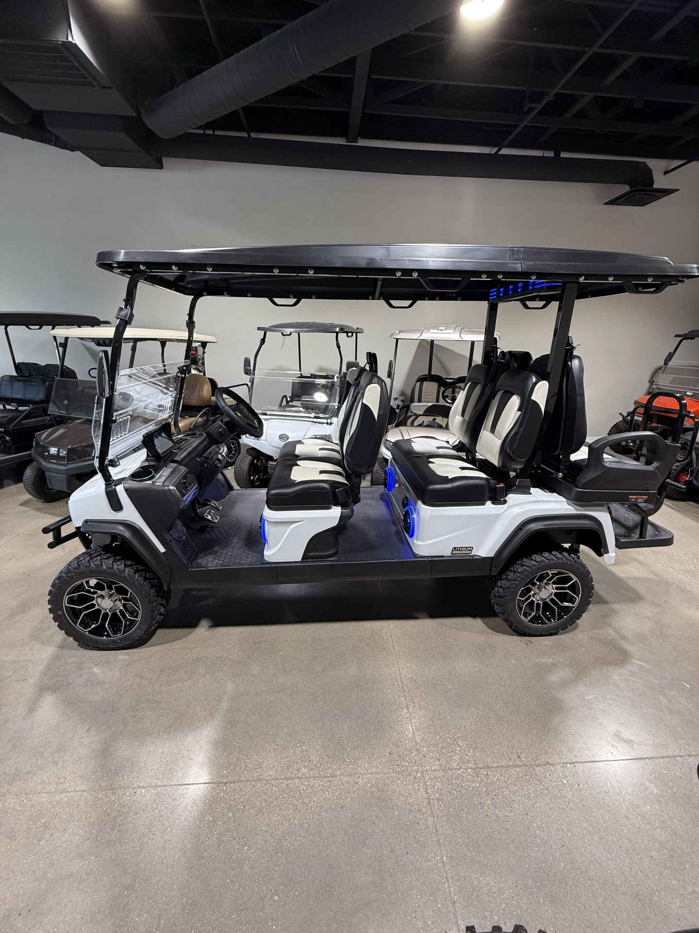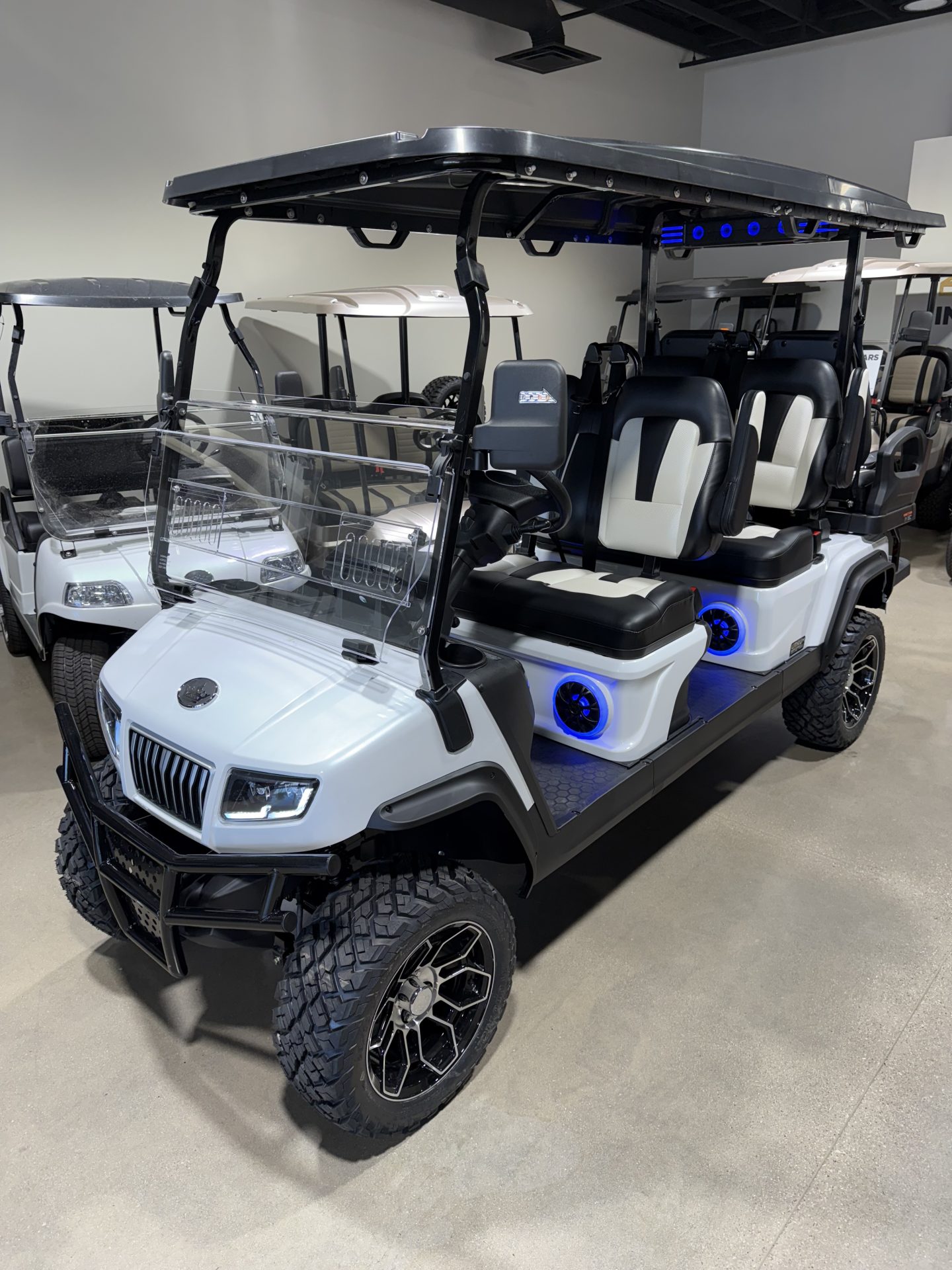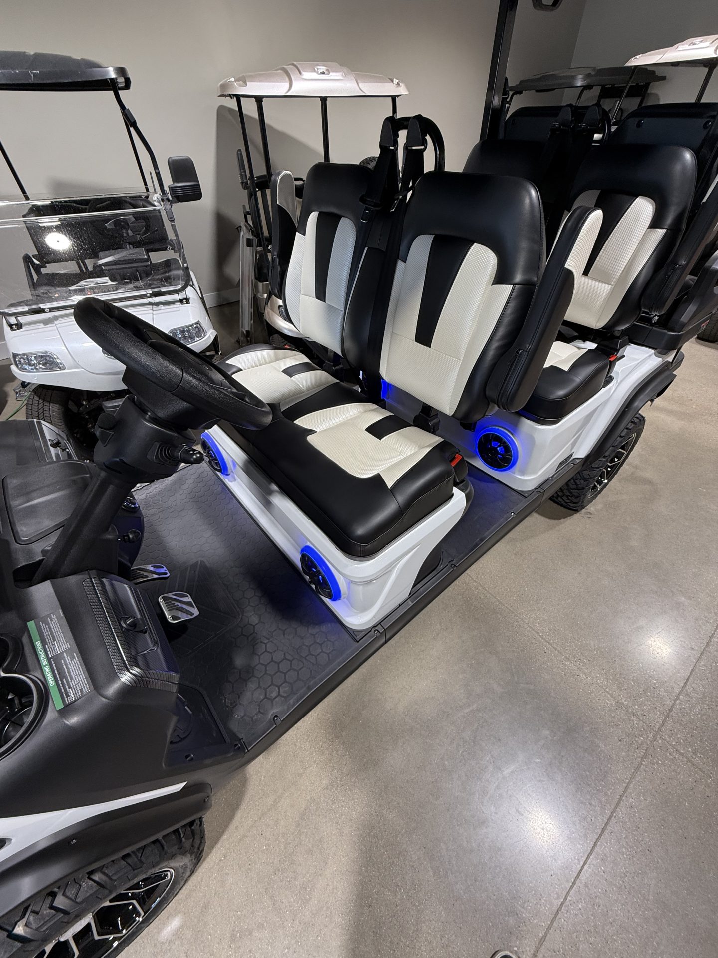 The Maverick 4+2 Plus redefines off-grid adventures, seamlessly merging sophisticated elegance with an audacious thirst for exploration. Equipped with off-road tires, this lifted golf cart transforms every trip into an exciting mix of smooth comfort and thrilling exploration. Featuring four illuminated speakers under seats, the Maverick Plus ensures that every journey is accompanied by high-quality sound, enhanced by dynamic lighting that sets the perfect mood, day or night.