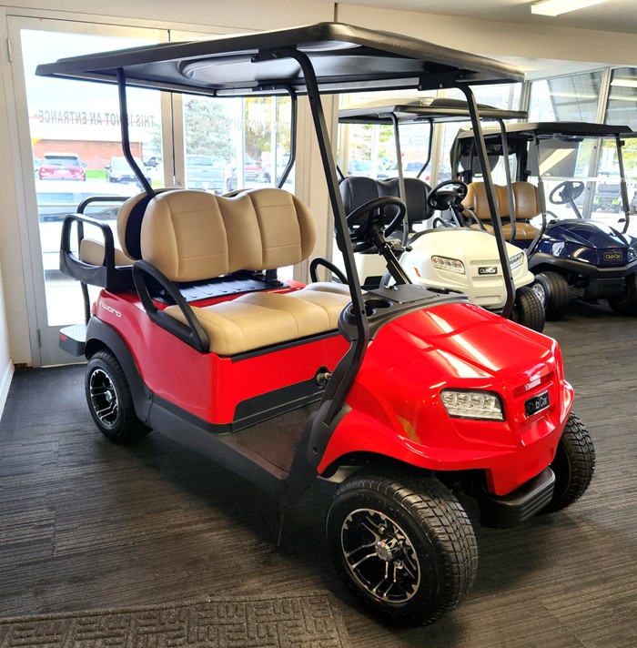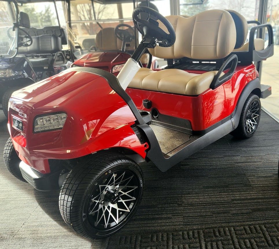 Brand New 2026 Club Car ONWARD electric golf cart in rally red. It has 4-passenger seating, Trojan batteries, and premium options. Visit our dealership in Sandy, Utah