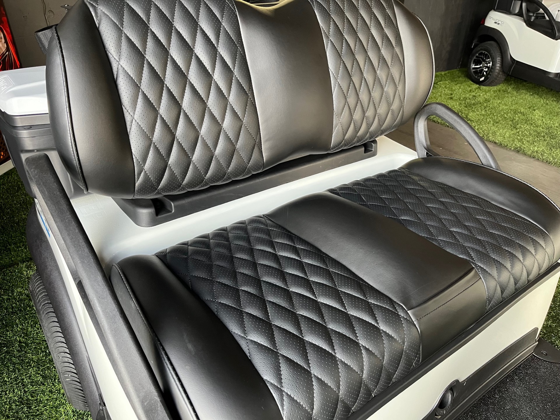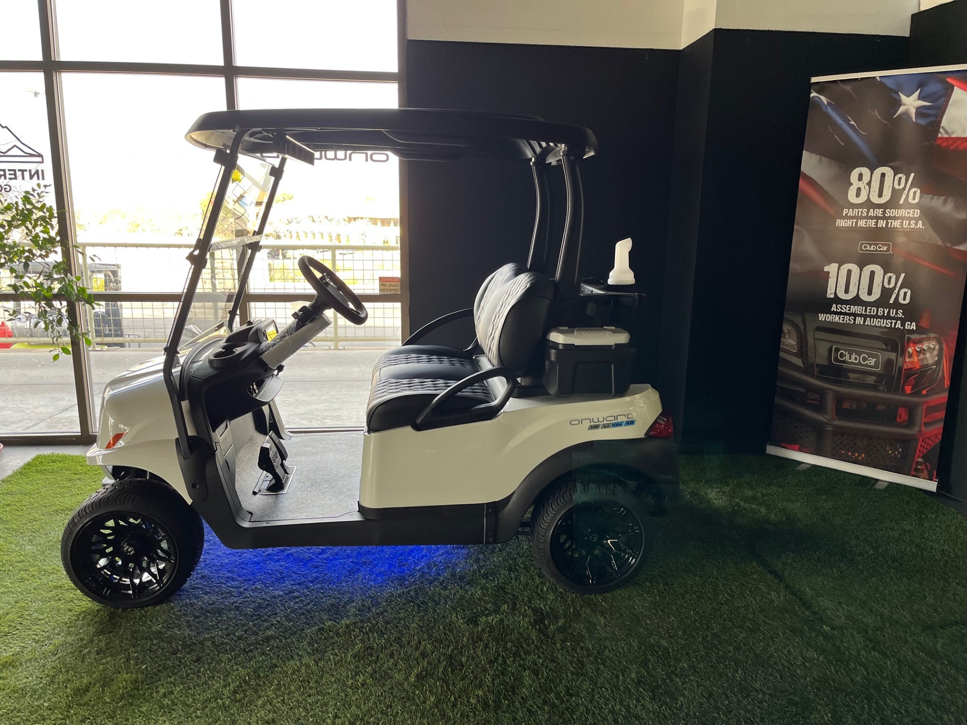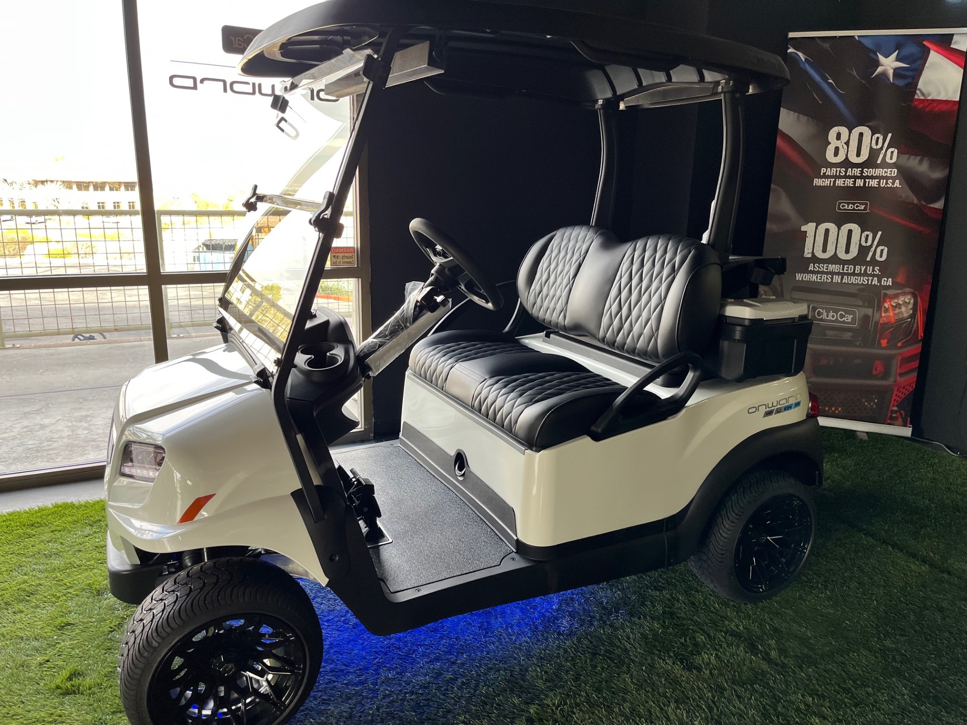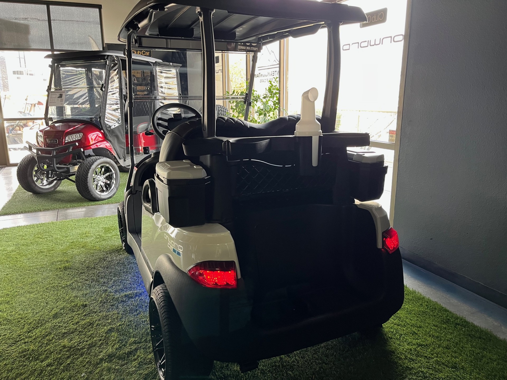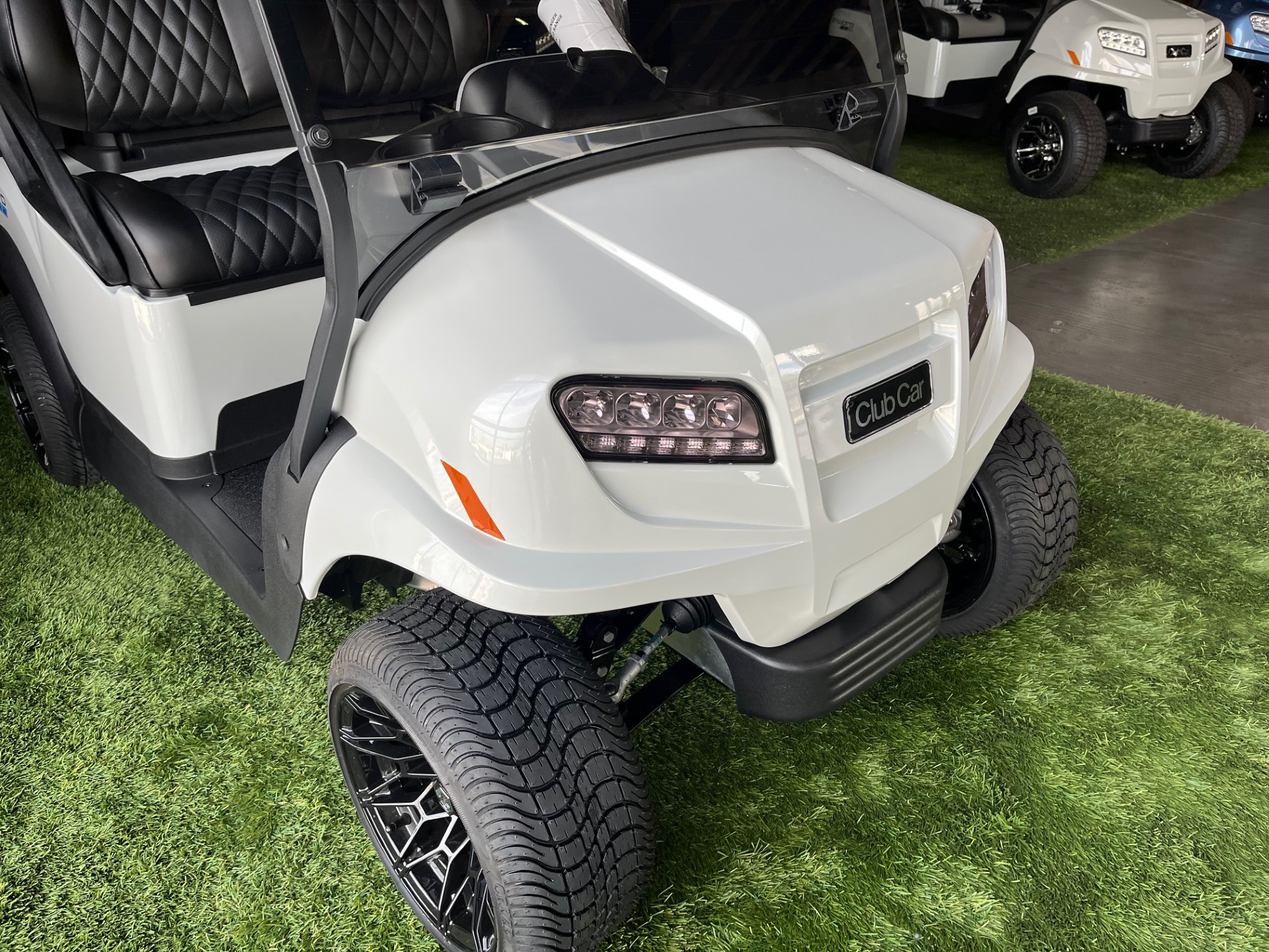 Extended Range Lithium Battery w/ Charger, Digital Display, Wireless Phone Charger x2, USB/USB-C Port, Custom 12″ Wheels w/ Low-Pro Curb Protection Tires, Custom Diamond Stitched Seating, Homelink Garage Door Opener, Remote Controlled Underglow LED Lights, Premium Tinted/Folding Windshield, Comfort Grip Steering Wheel w/ Scorecard Clip, Custom Tinted Headlights, Cooler x2, Sand/Seed Bottle