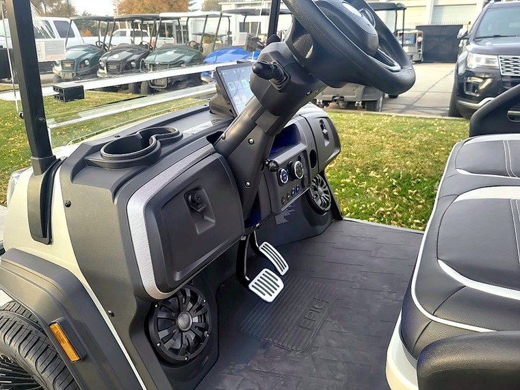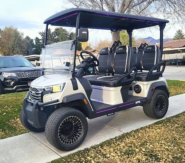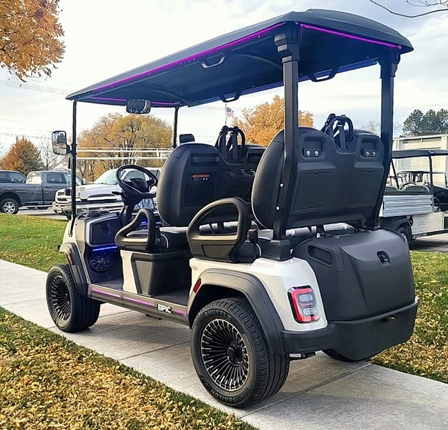 Meet the 2026 EPIC E40FX in jaw-dropping Metallic Pearl White. This isn’t a golf cart; it’s a 4-passenger, lifted, lithium-powered party on wheels. Built by ICON EV and loaded at Intermountain Golf Cars, it’s ready to own the course, the cul-de-sac, or the campsite.