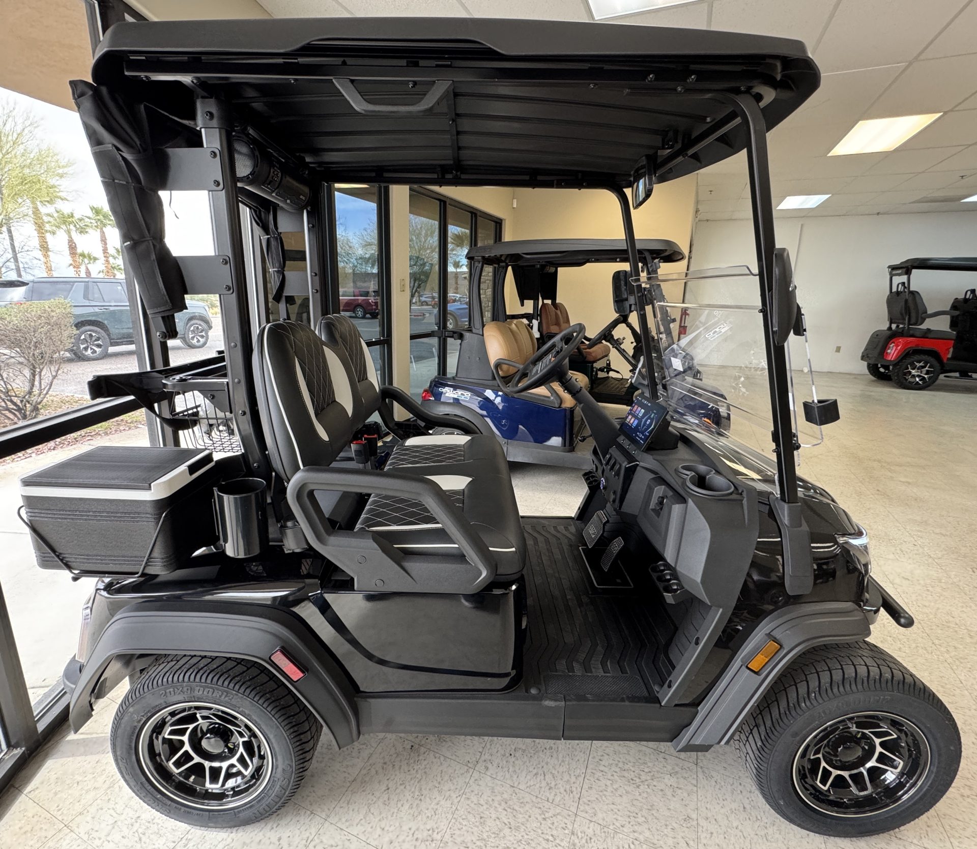 Finished in sleek black with bold black & white seats, this cart delivers aggressive styling, premium tech, and serious lithium performance.