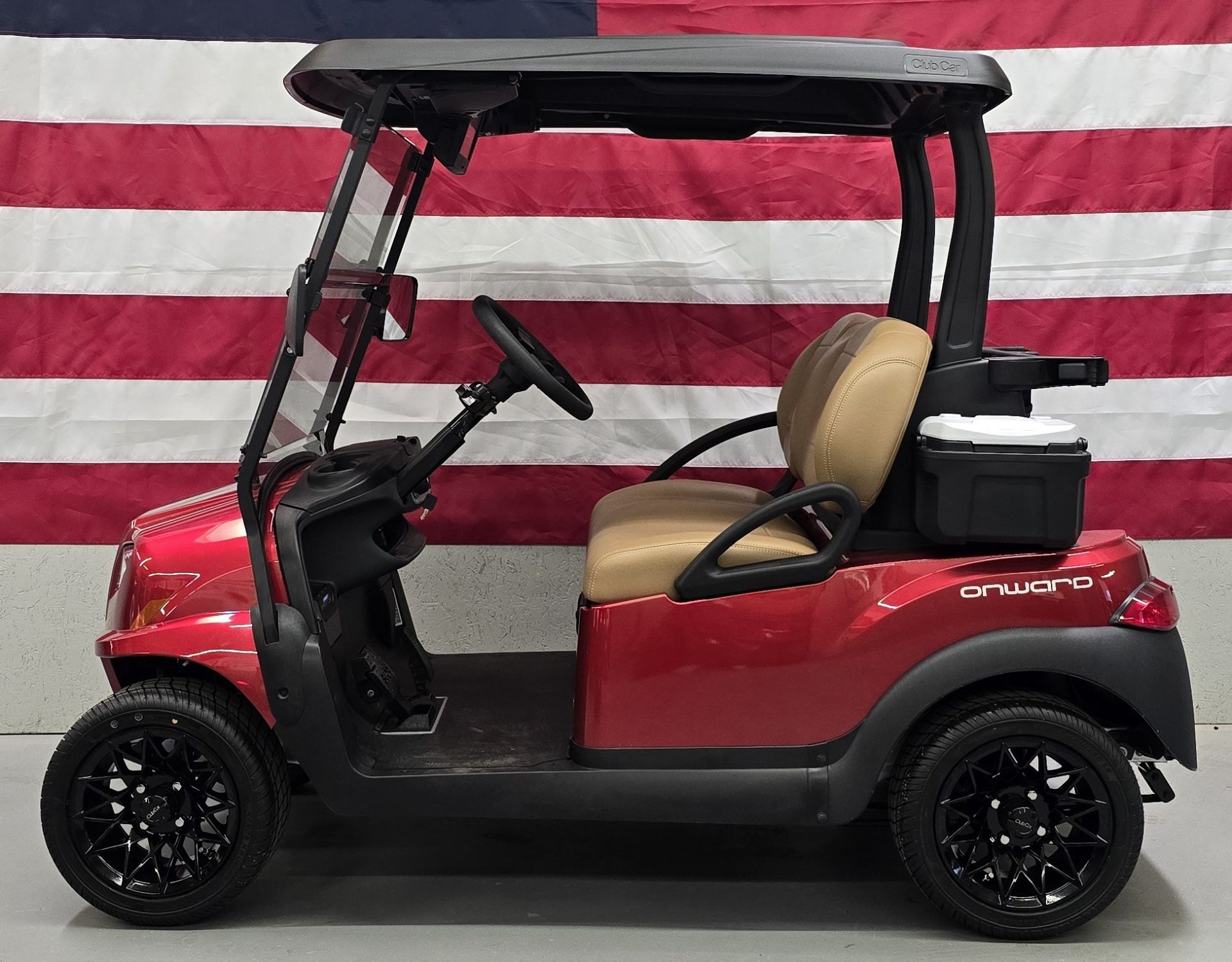 Brand New 2026 Candy Apple Red Club Car ONWARD – 105ah Lithium Battery, High Speed (25mph), Dual Wireless Phone Chargers, and Digital Display