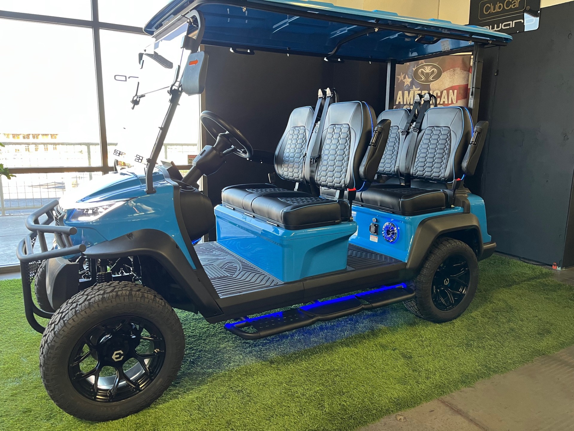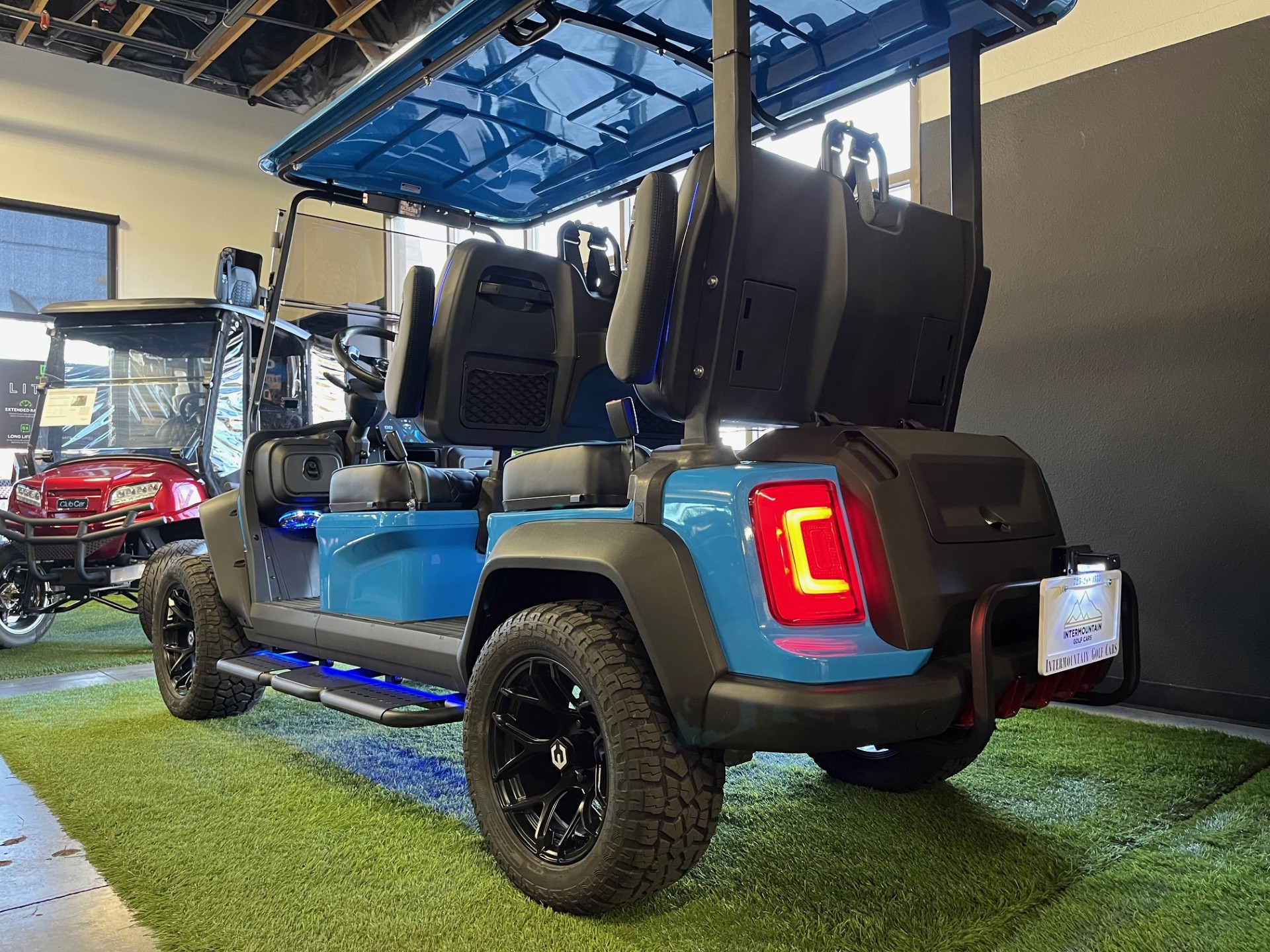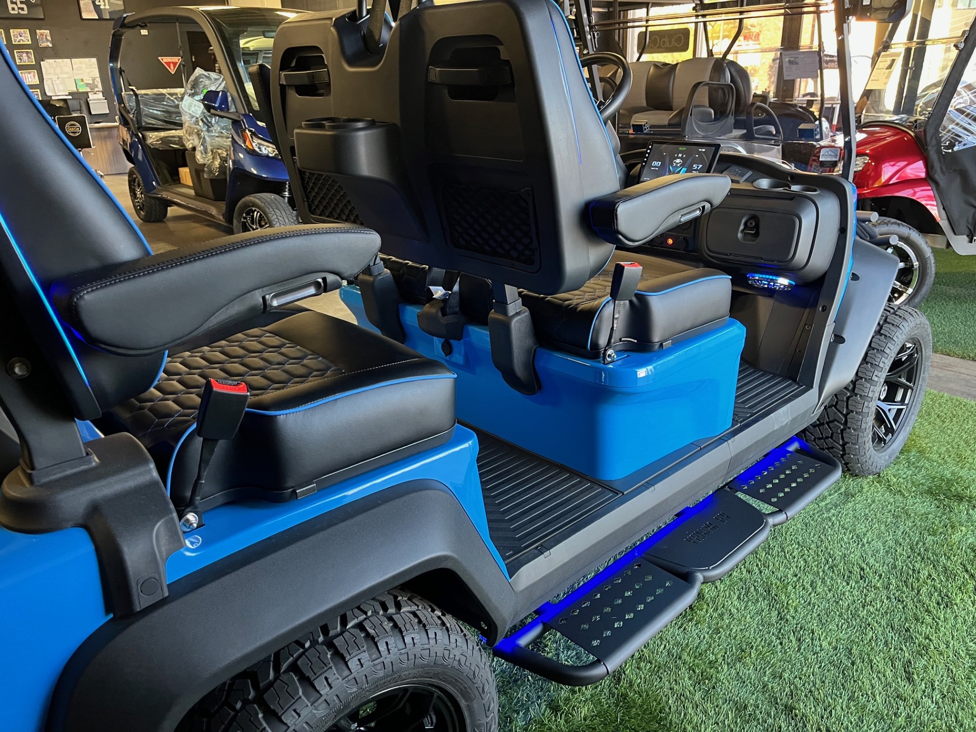 105ah Eco Lithium Battery w/ On-Board Charger, LSV-25mph, Digital Display w/ Carplay, 4-Speaker Sound System, Premium Color Matched Seating w/ Seat Belts, Locking Storage, LED Party Pack Lighting, Lifted Suspension, 14″ RideModz Wheels/Tires, Side Step Rails, USB/USB-C Port, Brush Guard