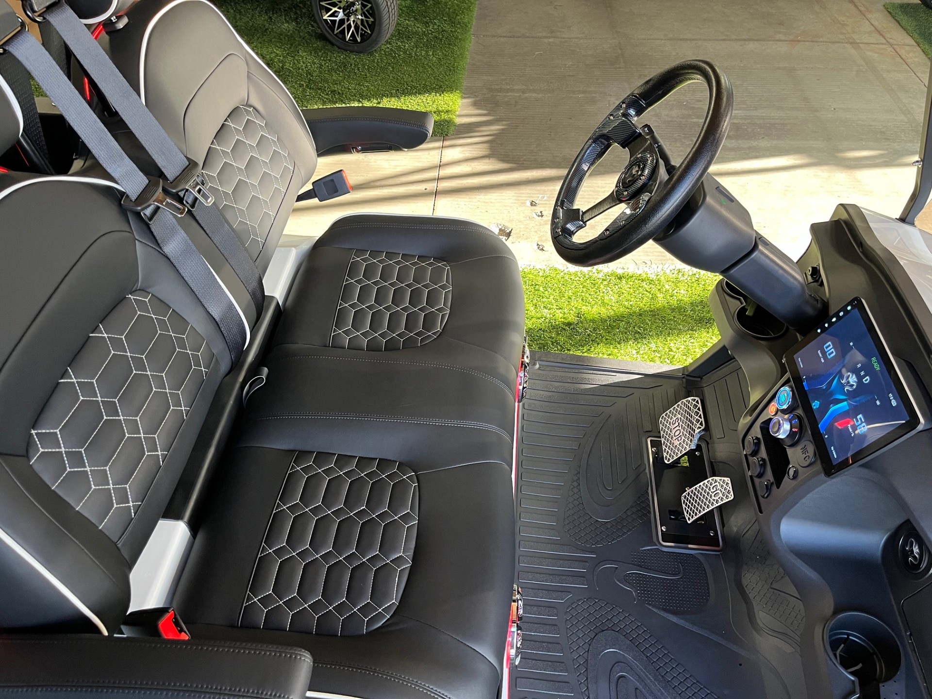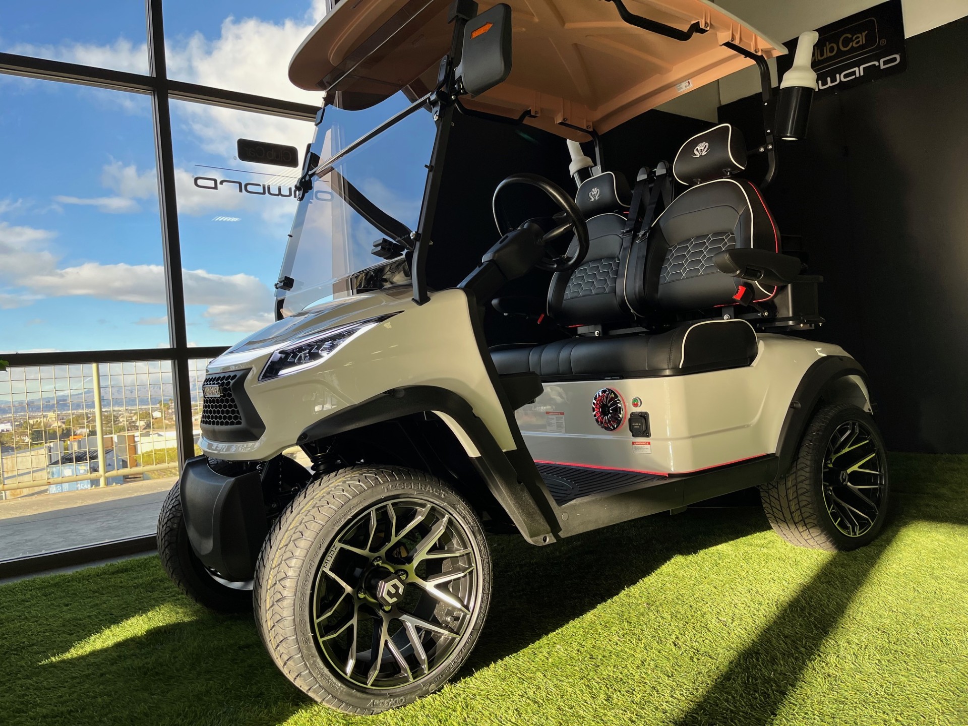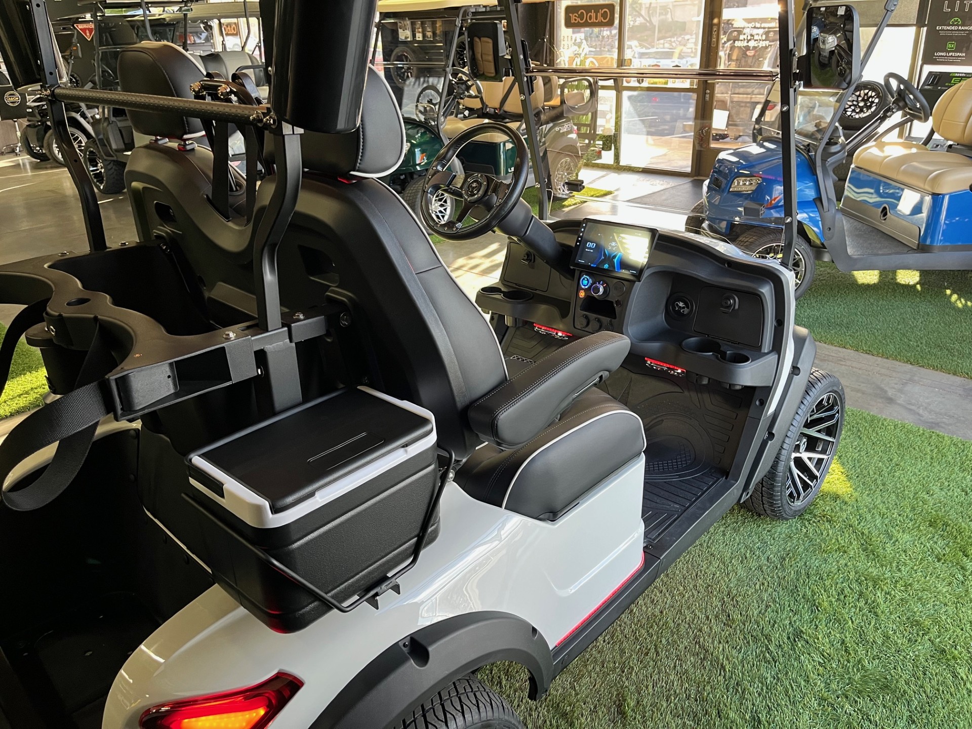 Eco Lithium Battery w/ On-Board Charger, LED Party Lights, Digital Display w/ Carplay, 4-Speaker Sound System, LSV(optional), 25mph, Premium Tinted/Folding Windshield, Ultra-Premium Seating w/ Seat Belts, Custom 14″ Wheels/Tires, Cooler, Ball/Club Washer, Sand/Seed Bottle x2