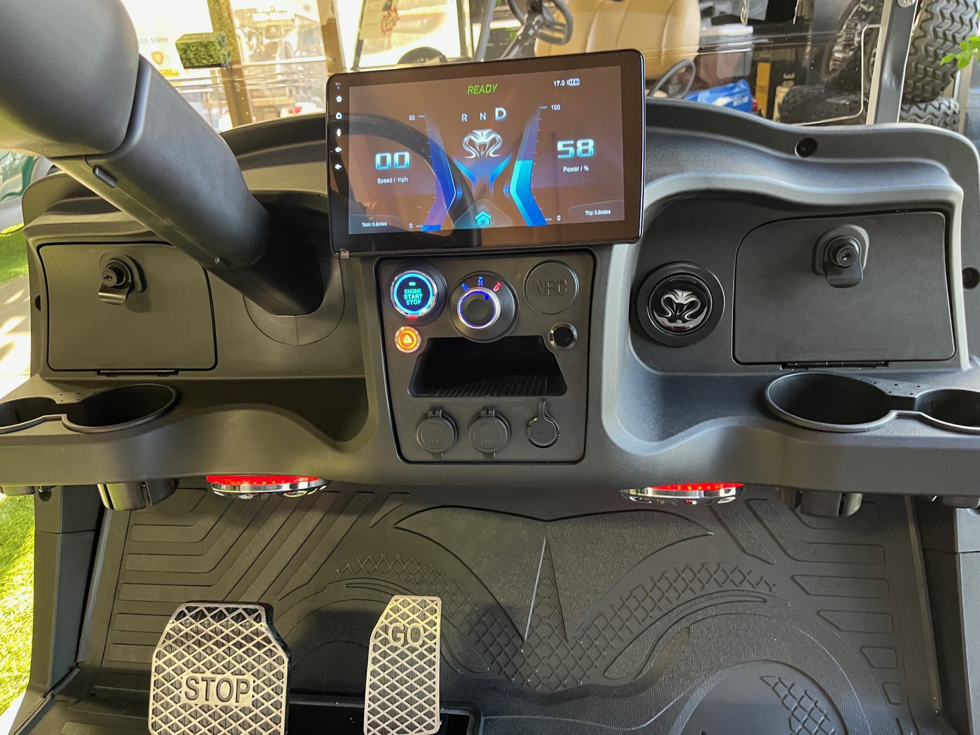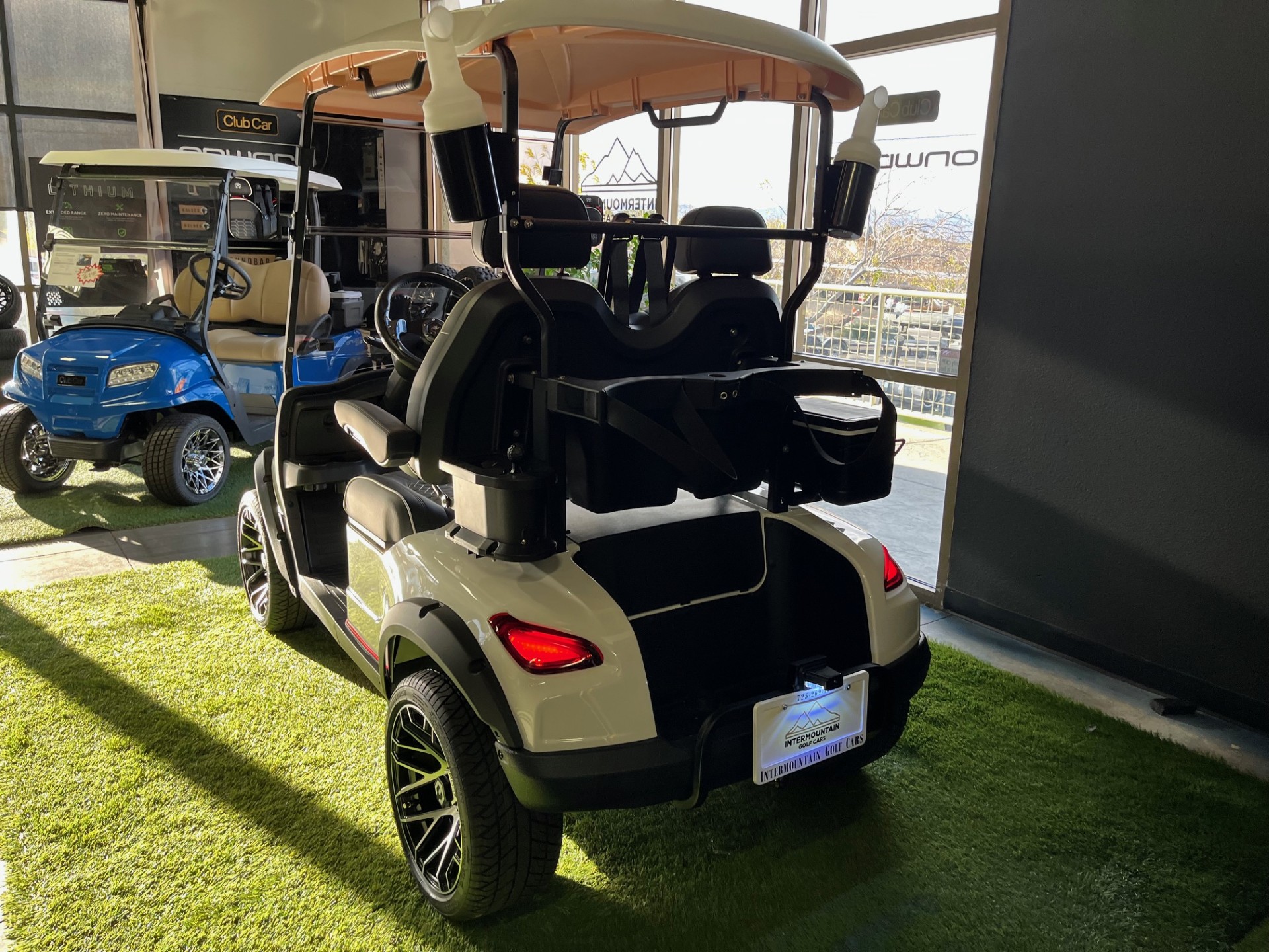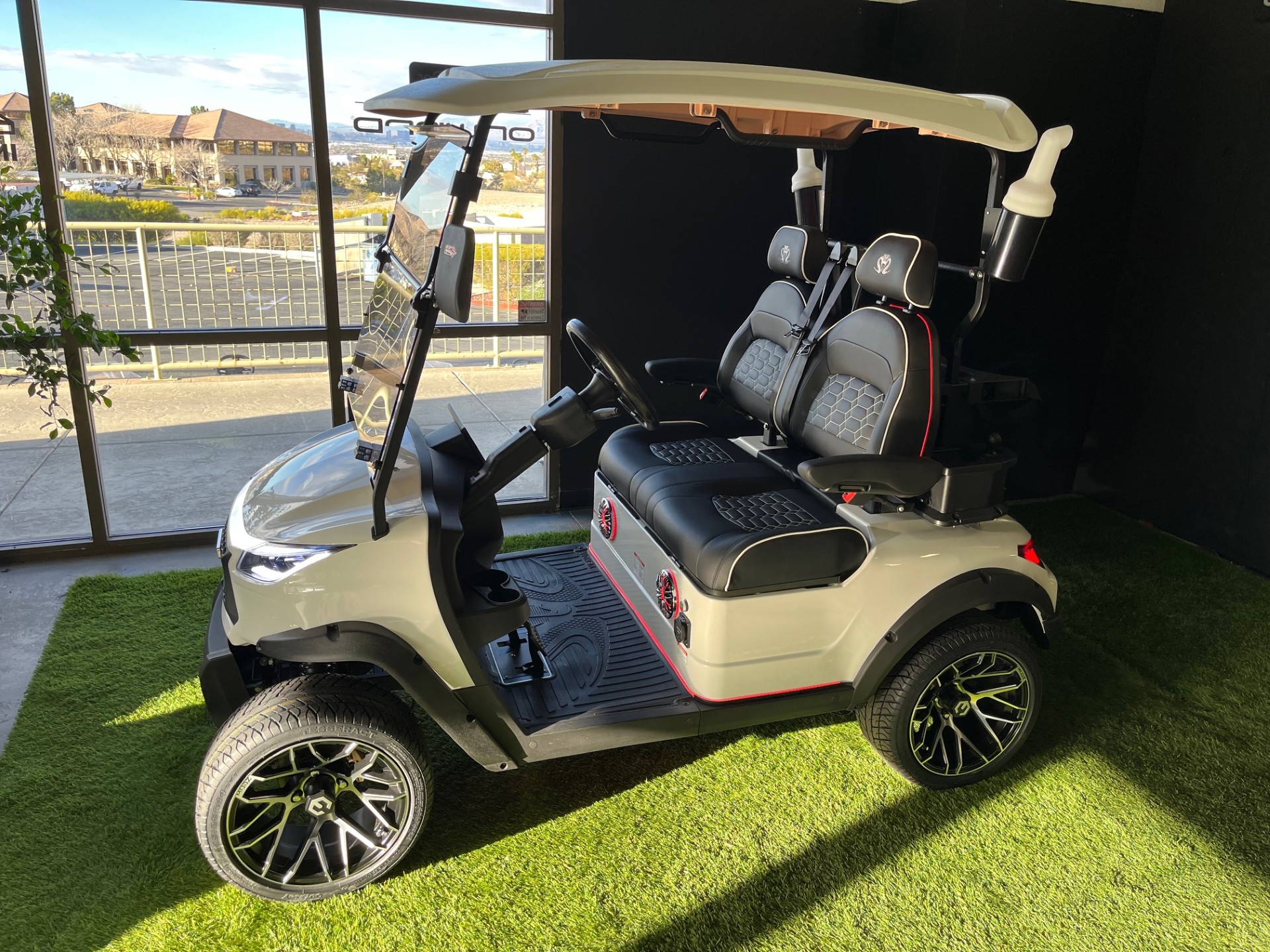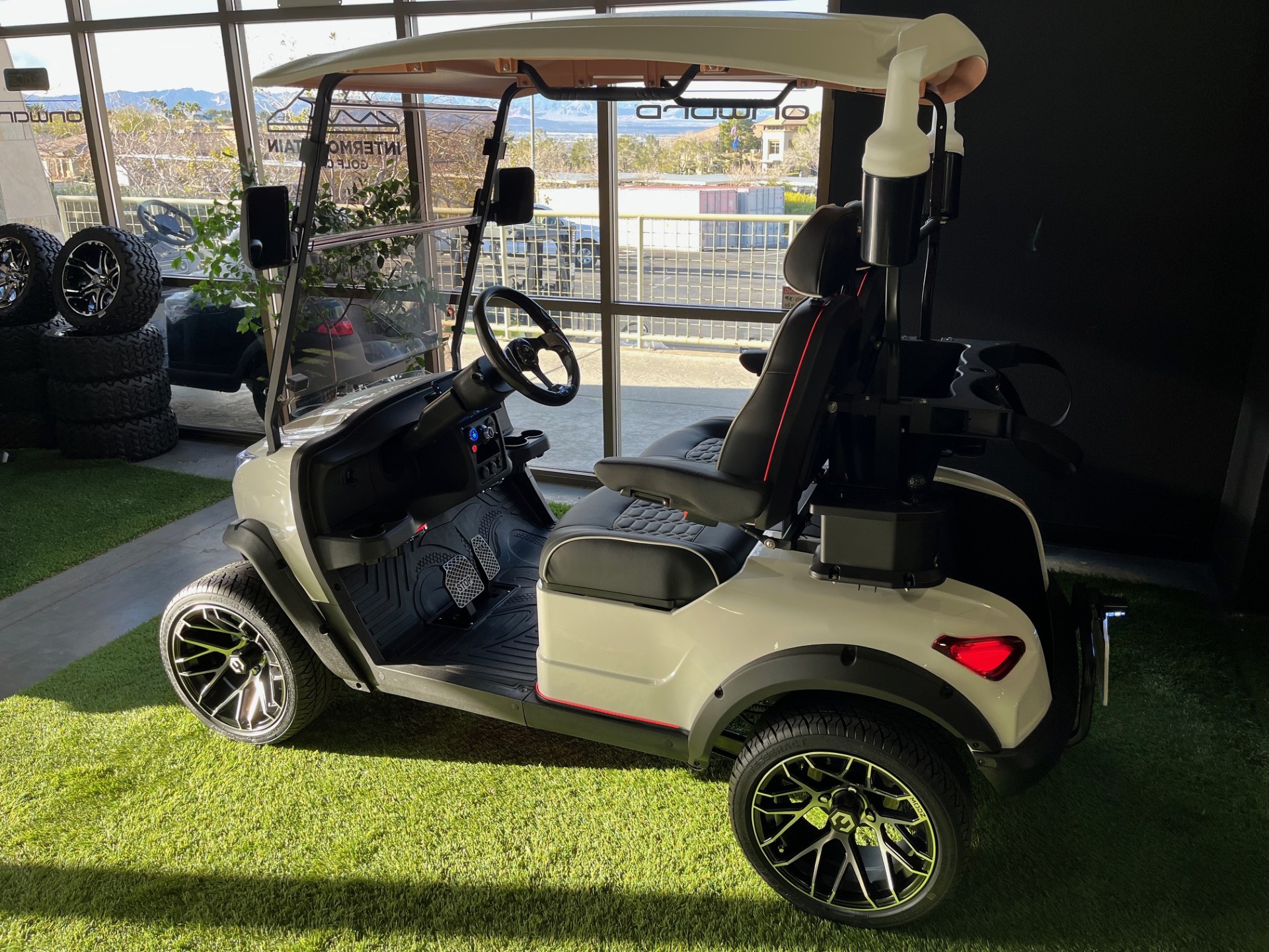 Eco Lithium Battery w/ On-Board Charger, LED Party Lights, Digital Display w/ Carplay, 4-Speaker Sound System, LSV(optional), 25mph, Premium Tinted/Folding Windshield, Ultra-Premium Seating w/ Seat Belts, Custom 14″ Wheels/Tires, Cooler, Ball/Club Washer, Sand/Seed Bottle x2
