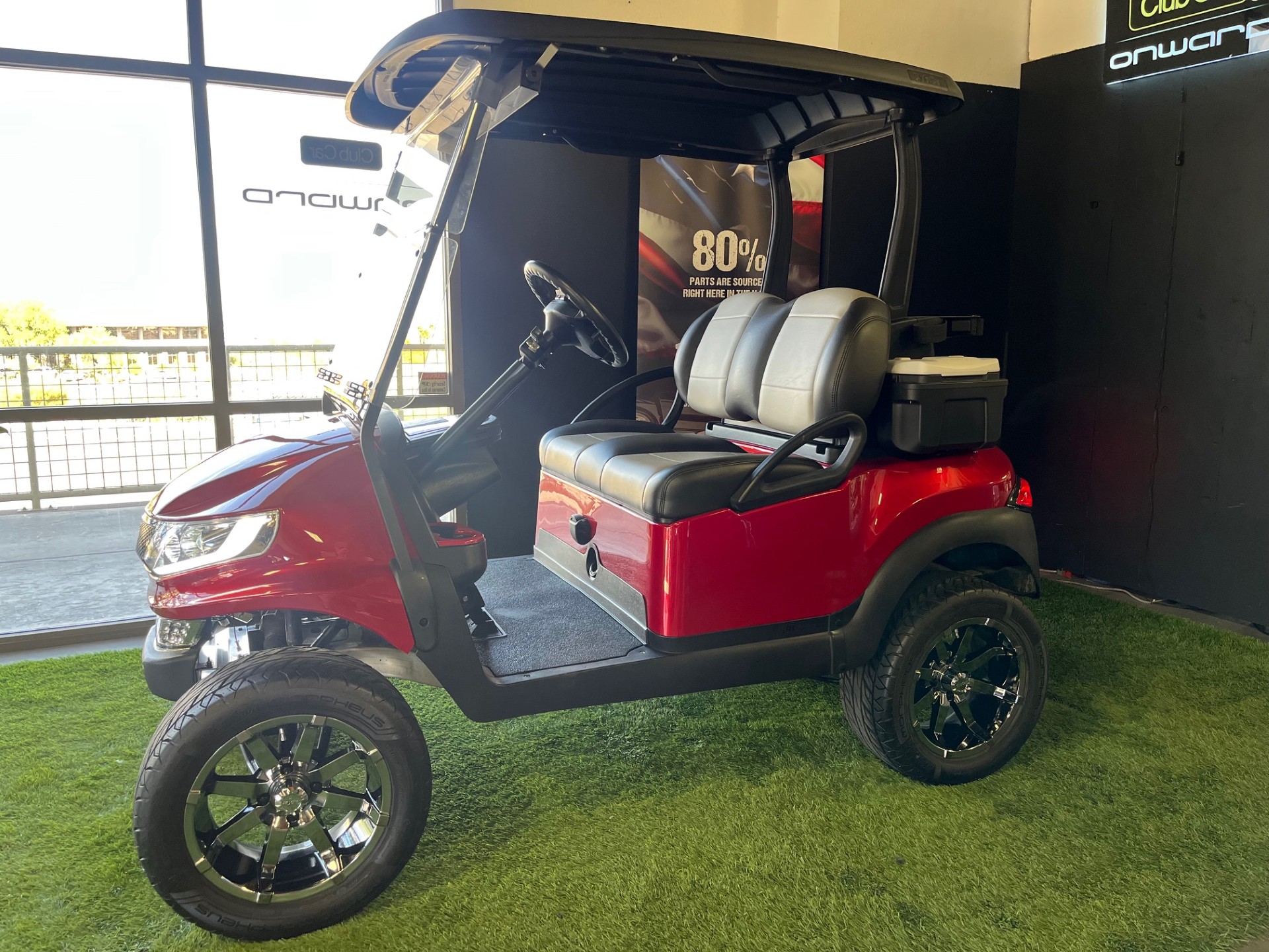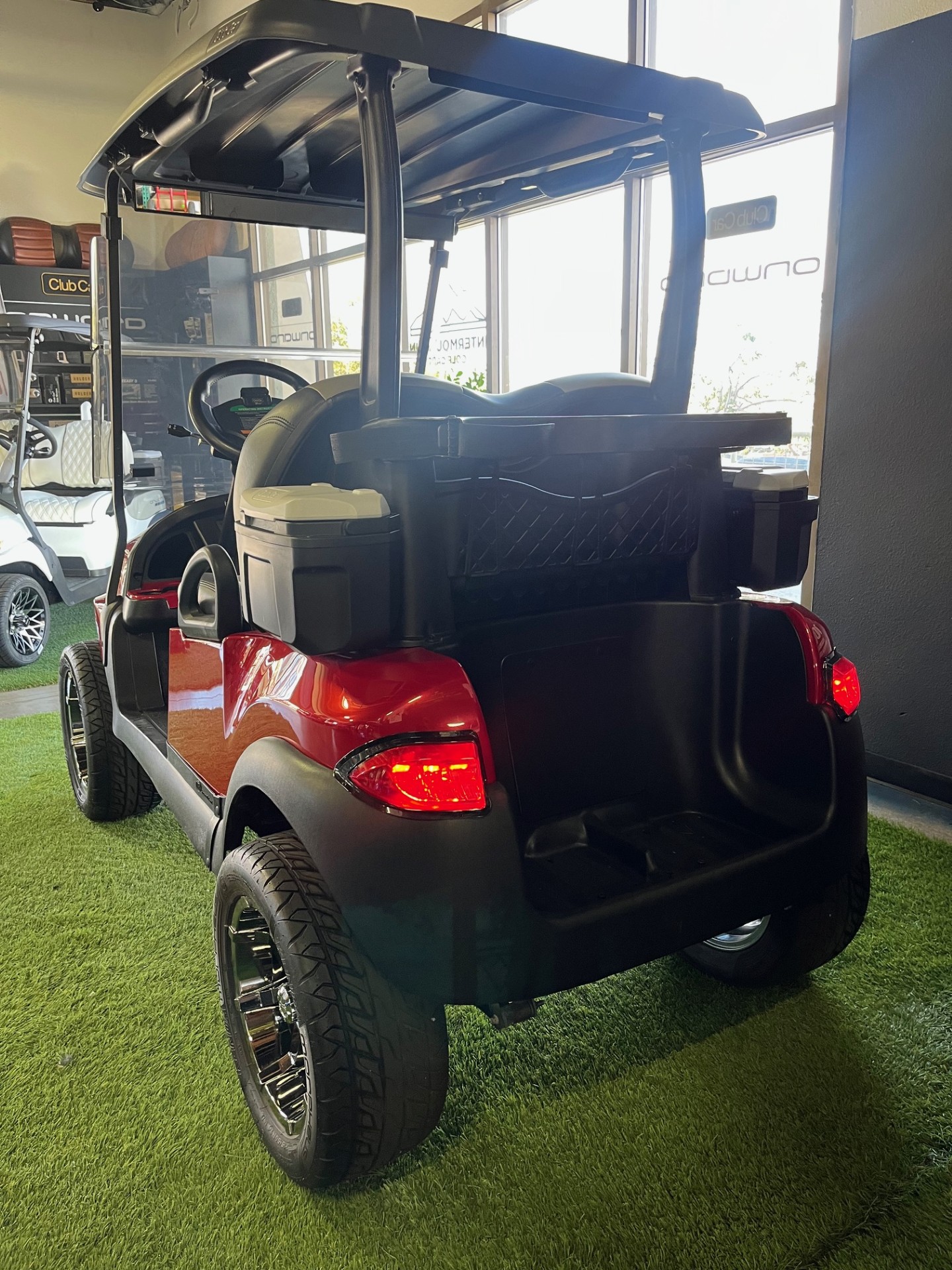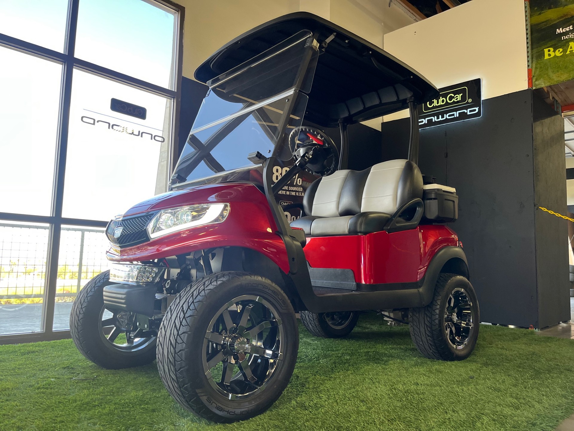 Eco Lithium Battery w/ On-Board Charger, Custom Phoenix Body Kit w/ Custom Color Matched Dash. Locking Storage, 4″ Suspension Lift Kit, 14″ Premium Smoked Chrome Wheels w/ 23″ Turf Approved Tires, Premium Seating, Tinted/Folding Windshield, Cooler x2.